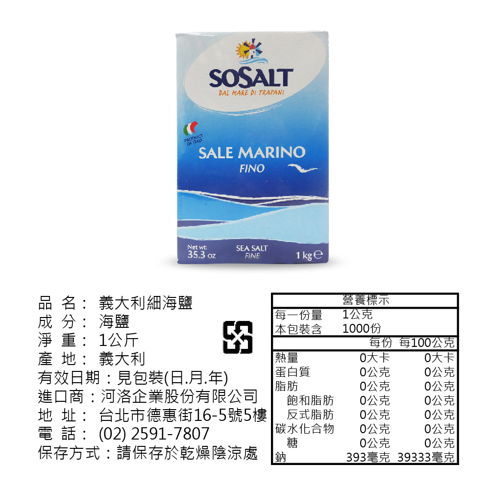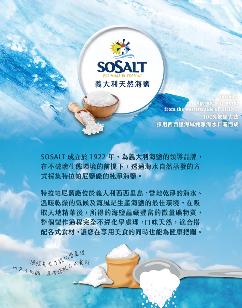 SOSALT 為義大利海鹽的領導品牌,採用地中海純淨海水於西西里島天然製成,所得的海鹽蘊藏豐富的微量礦物質,整個製作過程完全不經化學處理。