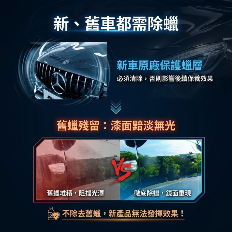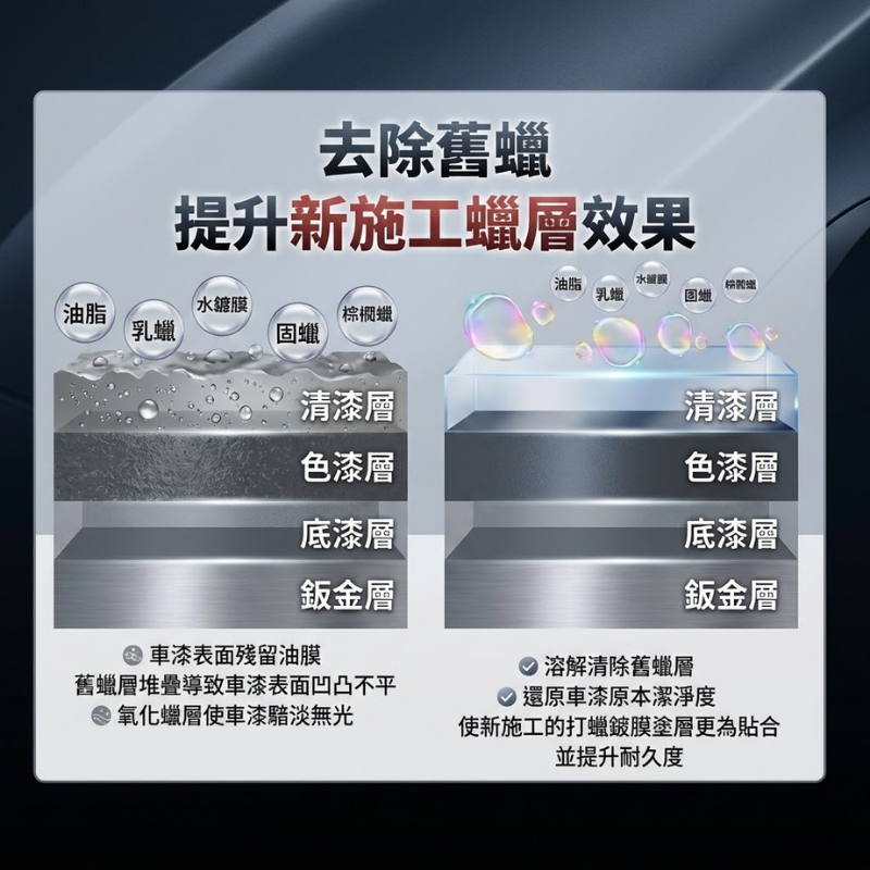 提升鍍膜附著力:在進行新車鍍膜或打蠟護理前使用,能大幅增加後續保養品的附著效果與持久度。