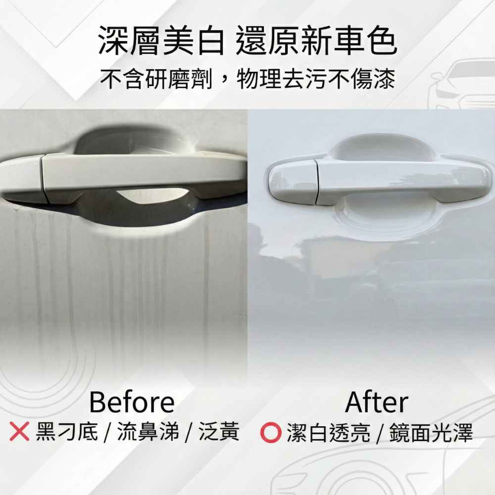 ✅ 白色/淺色車:強力去除「黑刁底」、流鼻涕水痕,將發黃氧化的舊車漆還原成新車般的透亮潔白。