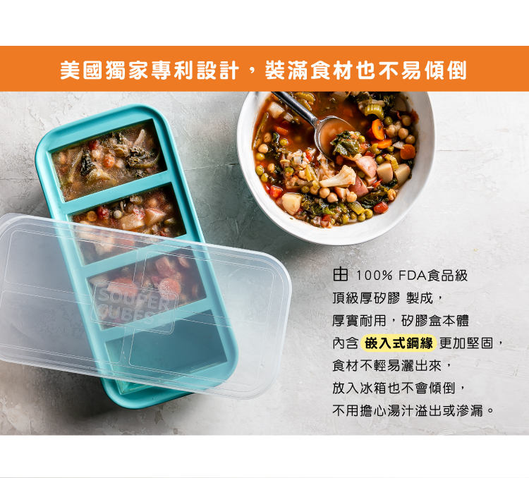 多功能食品級矽膠保鮮盒讓冷凍個人份量的湯品、嬰兒副食品、 醬料、 果汁等液 體變得更輕鬆簡單!採用100% FDA食品級頂級厚矽膠和鋼製邊緣製成,使盒身更加堅固避免溢出,好蓋又好裝。具有專利以及獨家設計的托盤可製作10.5x10.8x5.7公分+5.4x10.8x5.7公分大小的冰磚。每一格內都顯示刻度可清楚測量裝入的容量。不含BPA的上蓋可緊密貼合,以防止溢出、避免盒內食物沾染其他異味並易於堆疊及收納。不含雙酚A可安心使用。 可進洗碗機清洗。本體可進烤箱,安全溫度至212度(上蓋請勿放入).