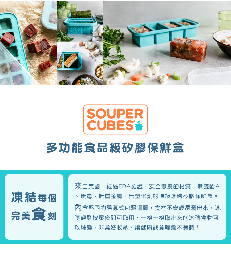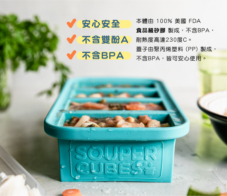 多功能食品級矽膠保鮮盒讓冷凍個人份量的湯品、嬰兒副食品、 醬料、 果汁等液 體變得更輕鬆簡單!採用100% FDA食品級頂級厚矽膠和鋼製邊緣製成,使盒身更加堅固避免溢出,好蓋又好裝。具有專利以及獨家設計的托盤可製作4.2x4.lx2.7公分大小的冰磚。每一格內都顯示刻度可清楚測量裝入的容量。不含BPA的上蓋可緊密貼合,以防止溢出、避免盒內食物沾染其他異味,並易於堆疊及收納。不含雙酚A可安心使用。 可進洗碗機清洗。本體可進烤箱,安全溫度至212度(上蓋請勿放入)