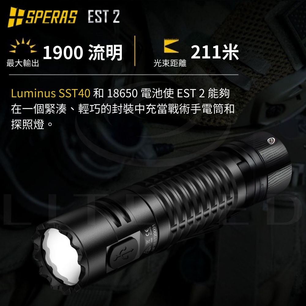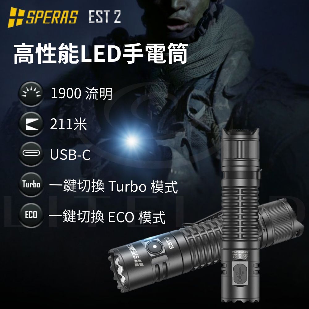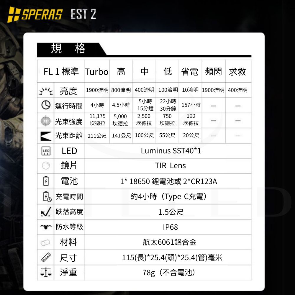 ● 最大輸出:1900流明● 最大光束距離:211米● 最大光強:11175cd● 最大運轉時間:ECO 模式下 157小時● 使用電池:18650 電池兼容 2顆CR123A● 產品尺寸:115 (長)*25.4 (高)*25.4 (厚) mm● 產品重量:74g (不含電池)● 防護等級:IP68 (水下2米),1.5 米抗衝擊 ● 操作方式:側按鍵+尾部戰術開關