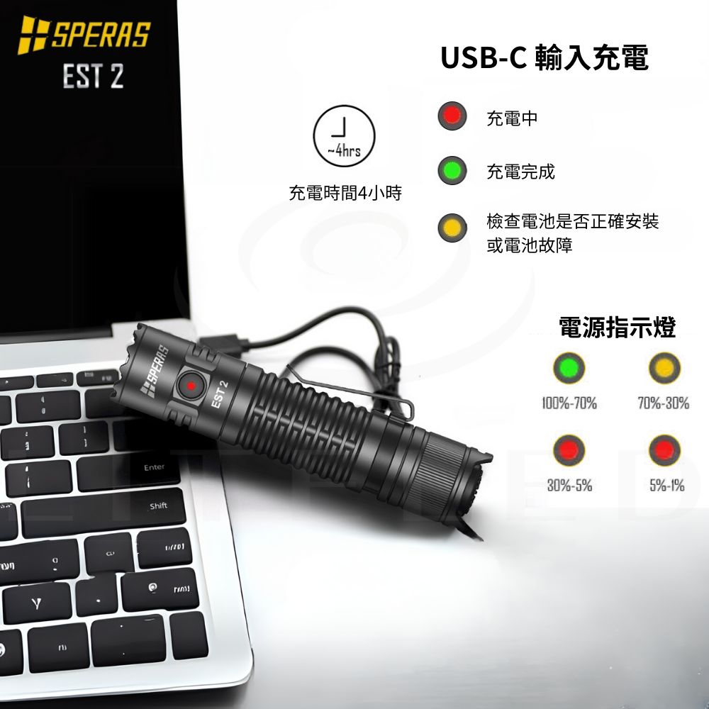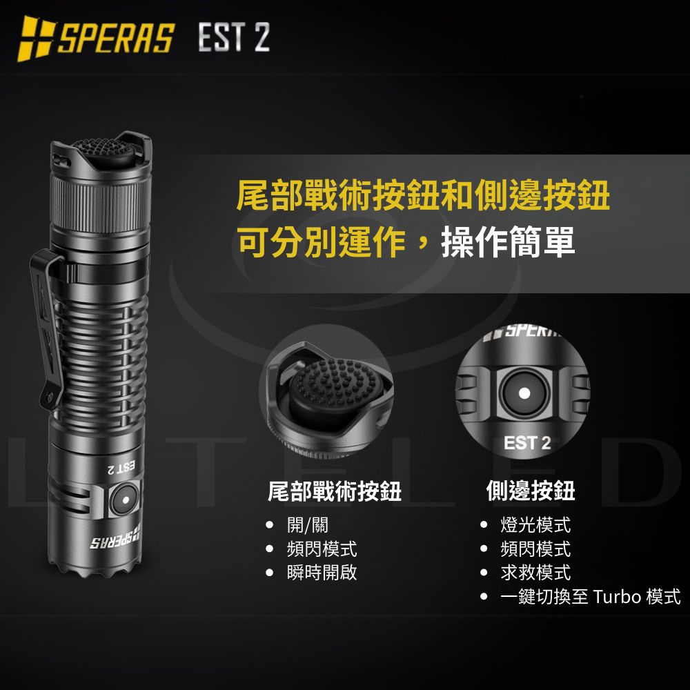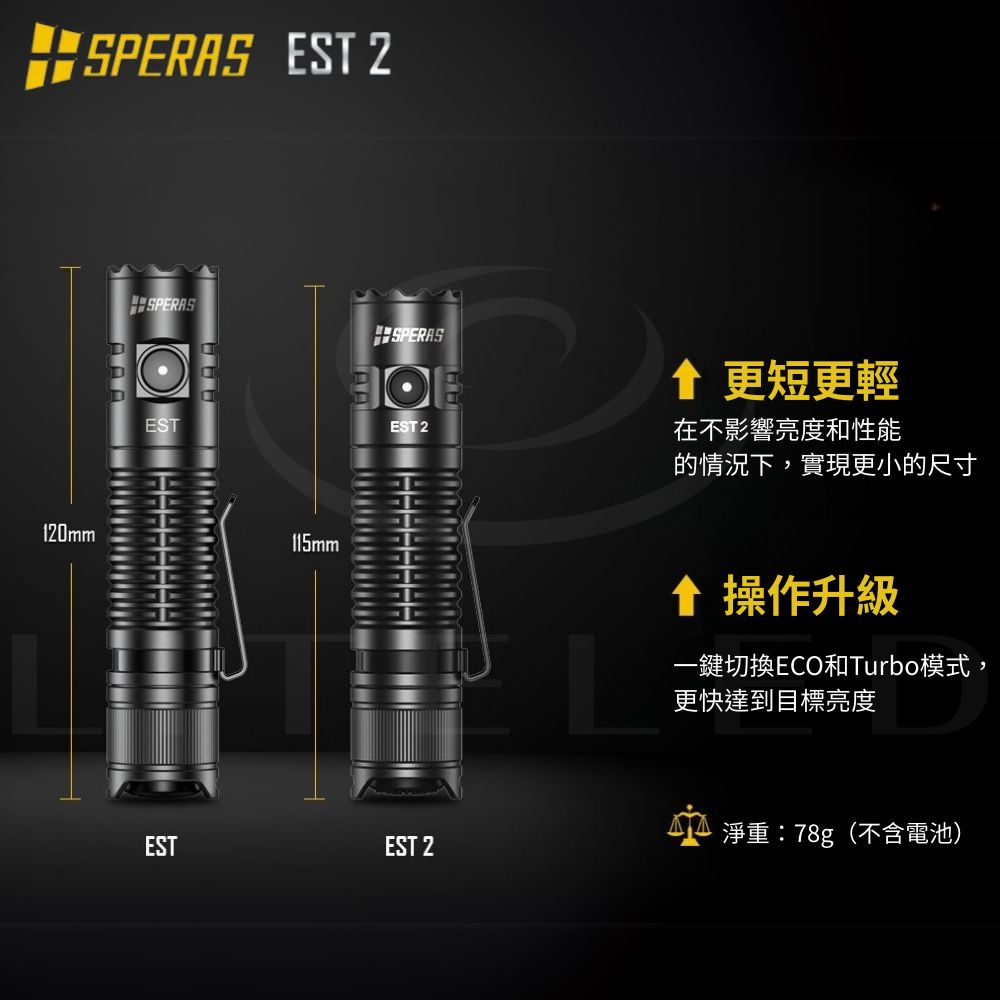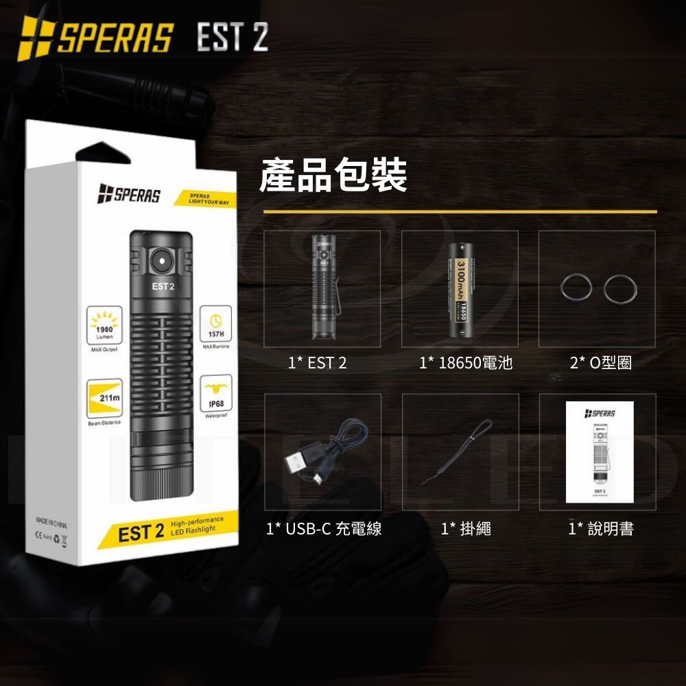● 最大輸出:1900流明● 最大光束距離:211米● 最大光強:11175cd● 最大運轉時間:ECO 模式下 157小時● 使用電池:18650 電池兼容 2顆CR123A● 產品尺寸:115 (長)*25.4 (高)*25.4 (厚) mm● 產品重量:74g (不含電池)● 防護等級:IP68 (水下2米),1.5 米抗衝擊 ● 操作方式:側按鍵+尾部戰術開關