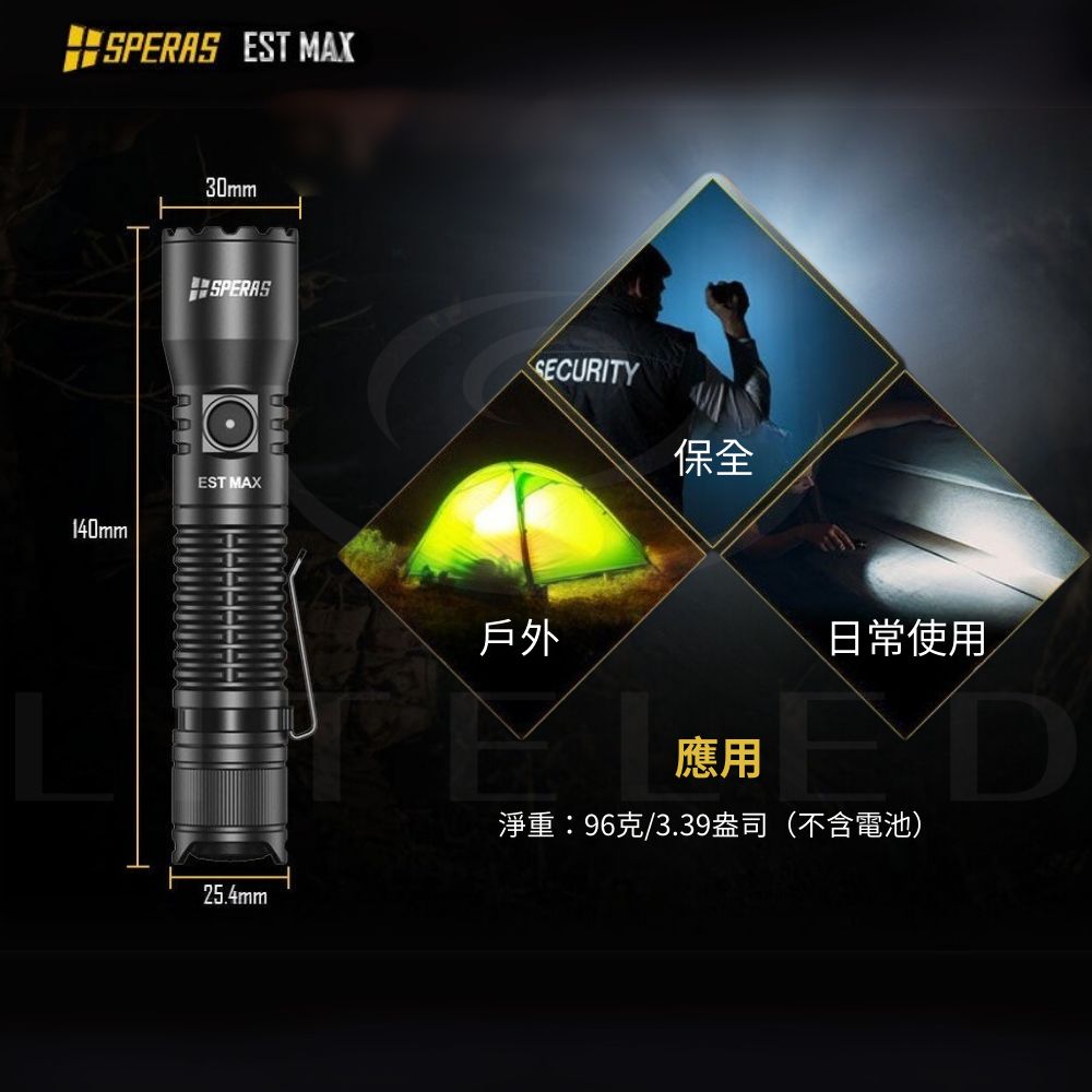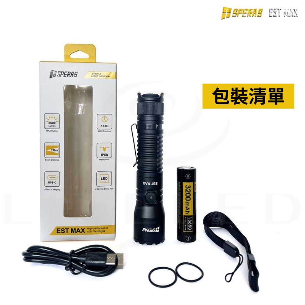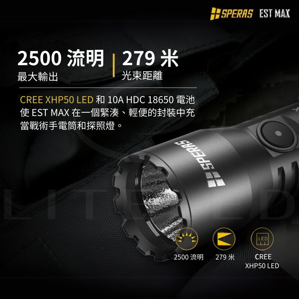 ● 最大輸出:2500流明● 最大光束距離:279米● 最大光強:19400cd● 最大運轉時間:低模式下180小時● 使用電池:專用18650電池● 產品尺寸:140(長)*30(高)*25.4(厚) mm● 產品重量:96g(不含電池)● 防護等級:IP68(水下2米),1.5米抗衝擊