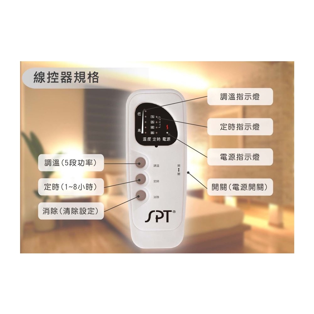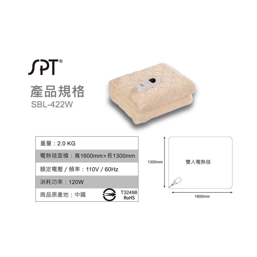 ◆消費權益◆■ 鑑賞期並非"試用期"。■ 退貨商品需是「全新商品」且「包裝完整」,包括外箱、包材、贈品等原廠所有配件,缺件、刮傷皆不同意退換貨。■ 大型家電一經拆箱定位安裝、插電及使用後,除原廠鑑定為商品問題外,不得以其他個人理由退換貨。■ 商品簽收前請務必確認商品型號、顏色正確,一經簽收即代表同意,不得以其他個人理由退換貨。■ 對商品有疑慮的地方請務必先詢問,能接受再訂購!■ 商品送達後若因買家因素無法安裝或拒收,買家需負擔賣家出貨產生的物流費用商品特色:可拆除式電毯控制器舒適睡眠設計面料材質:舒適泰迪絨通過國家安全標準檢驗5段溫度設定1~8小時時間設定商品規格:型 號SBL-422W消耗功率120W國際條碼4717365104224額定電壓AC110V/60HzBSMI驗證號碼T32498淨 重1.7 KG/台產 地中國商品尺寸130cm (W) * 160cm (L)外箱尺寸44cm (W) * 14cm (D) * 40cm (H)保固1年BSMI:T32498本商品資訊由網路及官網收集彙整而成,僅供參考,如有更新或異動不另外通知,正確商品資訊及規格以實機為準。鑑賞期非試用期,產品一經拆箱、插電及使用皆會影響您退貨權利。