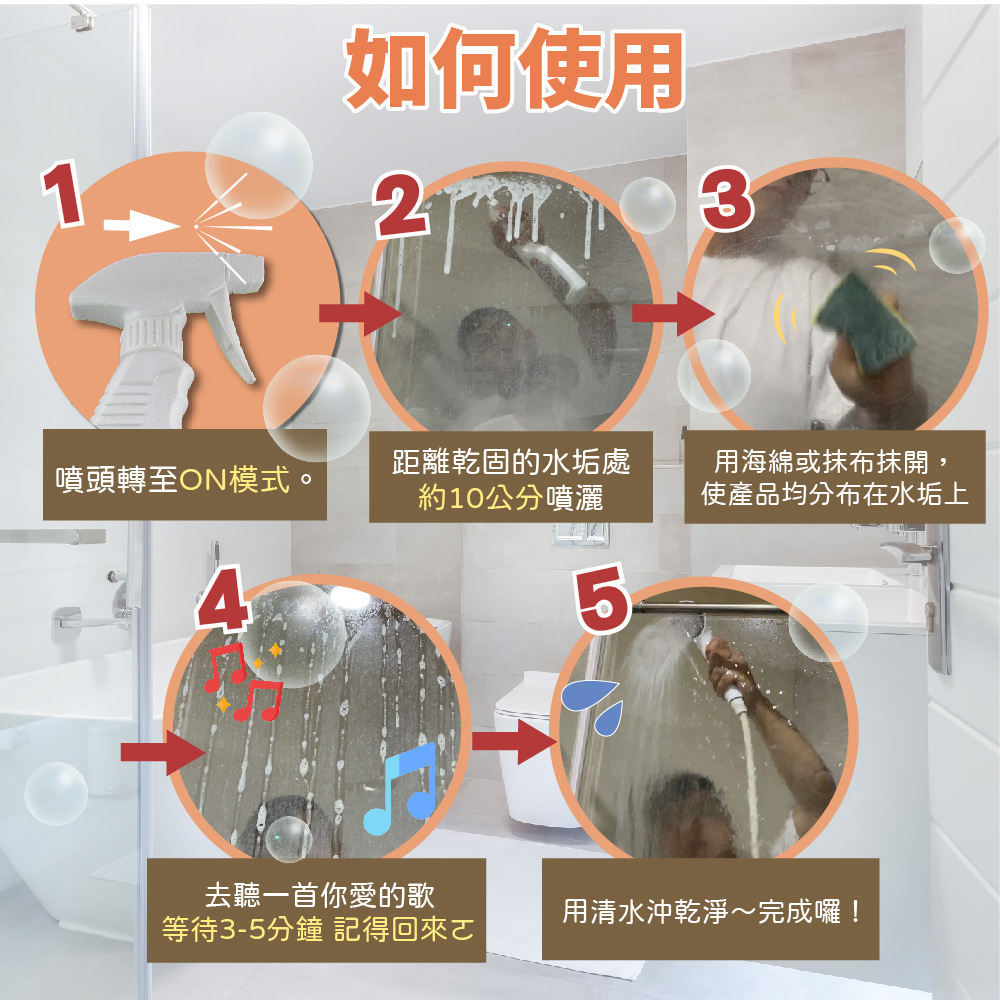速乾淨免刷洗|只需將本劑均勻分布在水垢處,無須刷洗、等待即可沖淨。