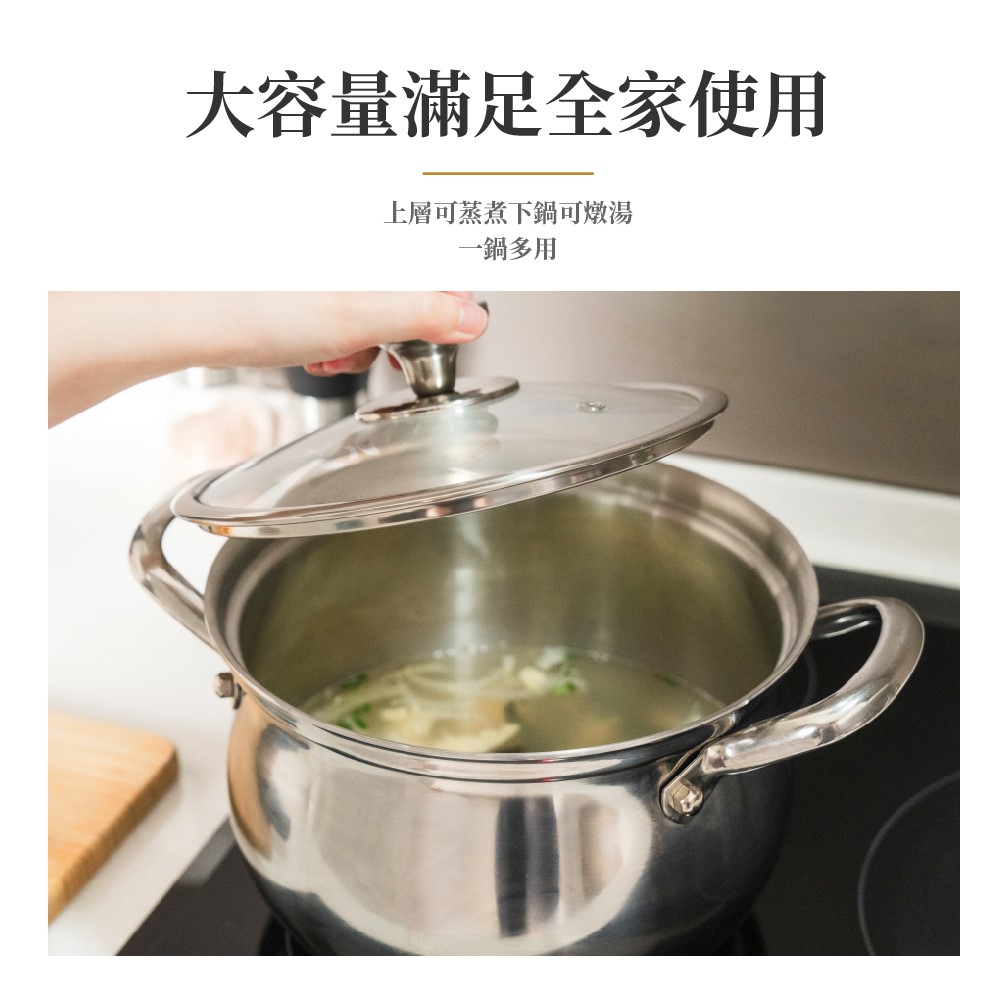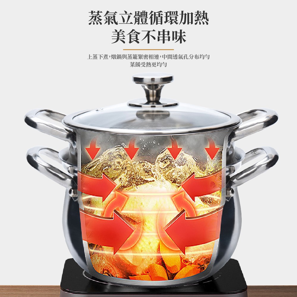 🔹多孔蒸格設計,蒸燉煮同步 🔹360'可視玻璃, 食物狀態一目了然🔹內鍋無鉚釘,無縫好清潔 🔹加蓋鎖鮮,烹飪輕鬆 🔹蒸氣立體循環,美食不串味商品規格:316不鏽鋼湯蒸鍋商品用途:食品料理烹調商品尺寸(長寬高) :長31cmX 寬25cm X 高22cm商品材質 :316不鏽鋼商品重量:鍋子1.9kg|蒸籠0.4Kg|鍋蓋0.5kg原產地(國):中國