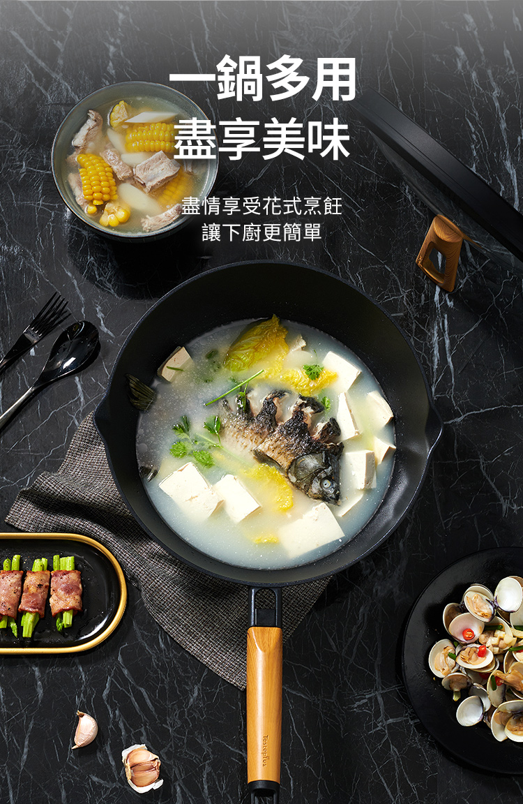 ※不建議經常烹飪貝殼類食物/帶骨頭的食物(長期烹飪堅硬食物會劃傷鍋子影響不沾效果和使用壽命)