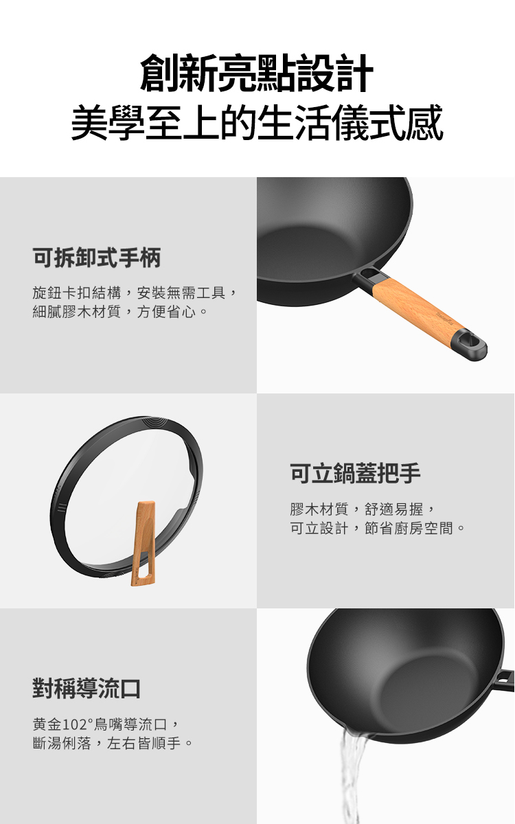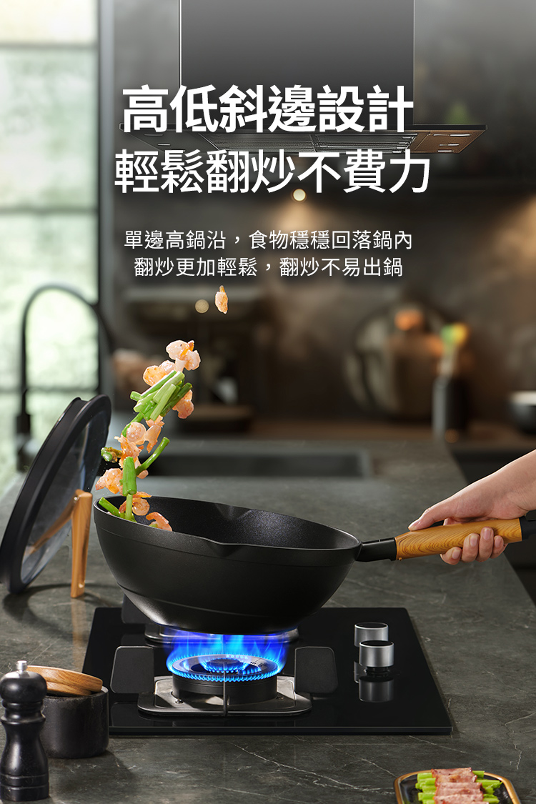 與傳統鍋的等高邊不同,採非均衡設計,拋甩食材時順著鍋型,