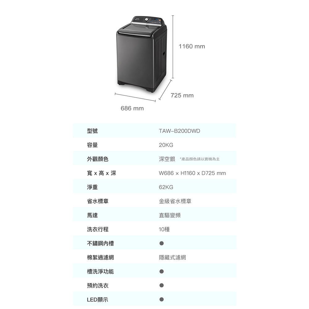 ■ 商品送達後若因買家因素無法安裝或拒收,買家需負擔賣家出貨產生的物流費用商品特色:Micro Bubble 微米氣泡洗衣NVC 噪音減震控制系統3D 動力水流瀑布10 種行程、10 段水位水流強度選擇冷風乾燥緩降上蓋DD 直驅變頻馬達IDD 智慧控制系統商品規格:型號:TAW-B200DWD洗衣容量:20 KG電壓:110V / 60Hz尺寸:寬686*高1160*深725MM重量:62 KG內槽材質:不銹鋼洗衣槽類型:單槽馬達型式:變頻馬達保固:全機一年,如有異動以原廠公告為主產地:泰國貨源:公司貨BSMI:R34518本商品資訊由網路及官網收集彙整而成,僅供參考,如有更新或異動不另外通知,正確商品資訊及規格以實機為準。鑑賞期非試用期,產品一經拆箱、插電及使用皆會影響您退貨權利。廢四機回收資訊:新購公告指定規格之電視機、洗衣機、電冰箱或冷、暖氣機時,販賣業者應提供同項目、數量、時間及同送達地址之廢四機回收(搬、載運)無償服務。但不包含為搬運、拆卸而動用大型機具、工程或危險施工等。消費者本人簽名確認已被口頭告知或知悉上述權益。本站配合環保署廢四機回收服務,本公司廢四機回收專線:0800-550678,環保署資源回收專線0800-085717。