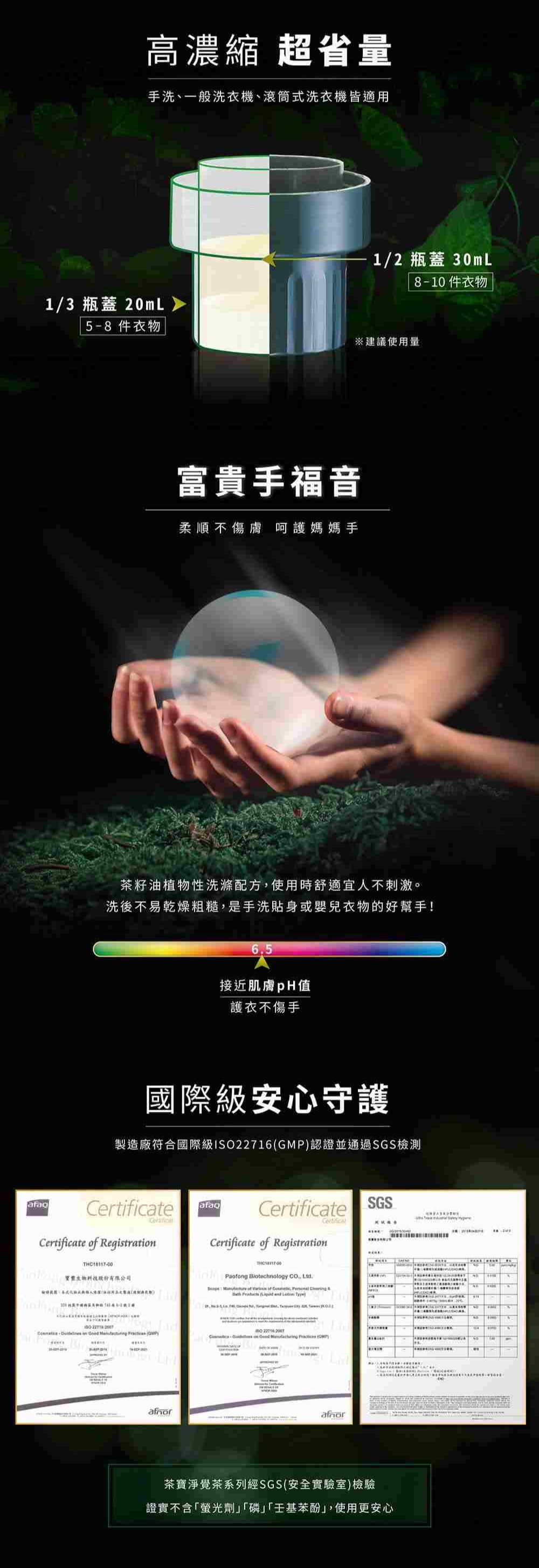 ●採用台灣珍貴茶籽精華的潔淨配方,茶籽皂素提升洗淨力,自然分解汙垢,不擔心殘留衣物,好洗又環保。●植物性潔淨配方,溫和洗淨且無磷、無螢光劑、無漂白劑,安心守護全家人!●以純植物香氛精油取代化學香精,安全溫和,洗後衣物散發淡淡清香。●高倍濃縮用量省,好沖洗、不易殘留,幫助省水、省電節能。●溫和配方不傷手,可手洗貼身絲質及嬰幼兒衣物。●一般洗衣機、滾筒式洗衣機皆適用。