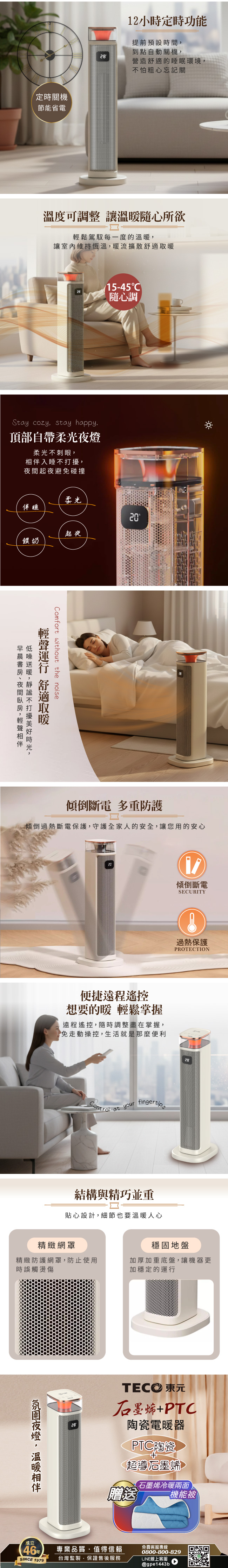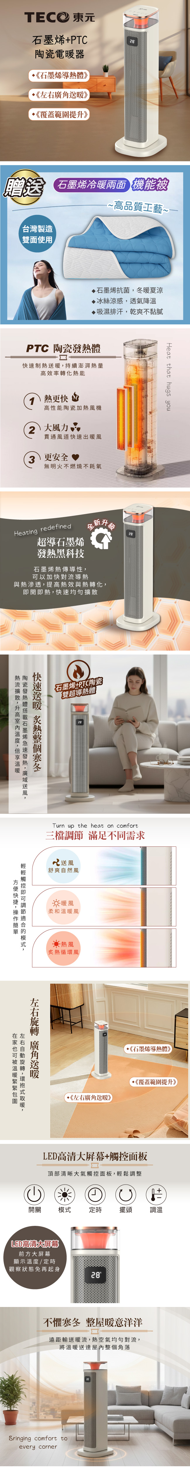 採用石墨烯+PTC陶瓷雙超導熱體無光害、無噪音、無耗氧、無輻射觸控式按鍵,LED智慧大螢幕顯示屏可左右自動擺頭,廣角送暖頂部氛圍燈光,增加閨房氛圍傾倒斷電裝置,安全更安心