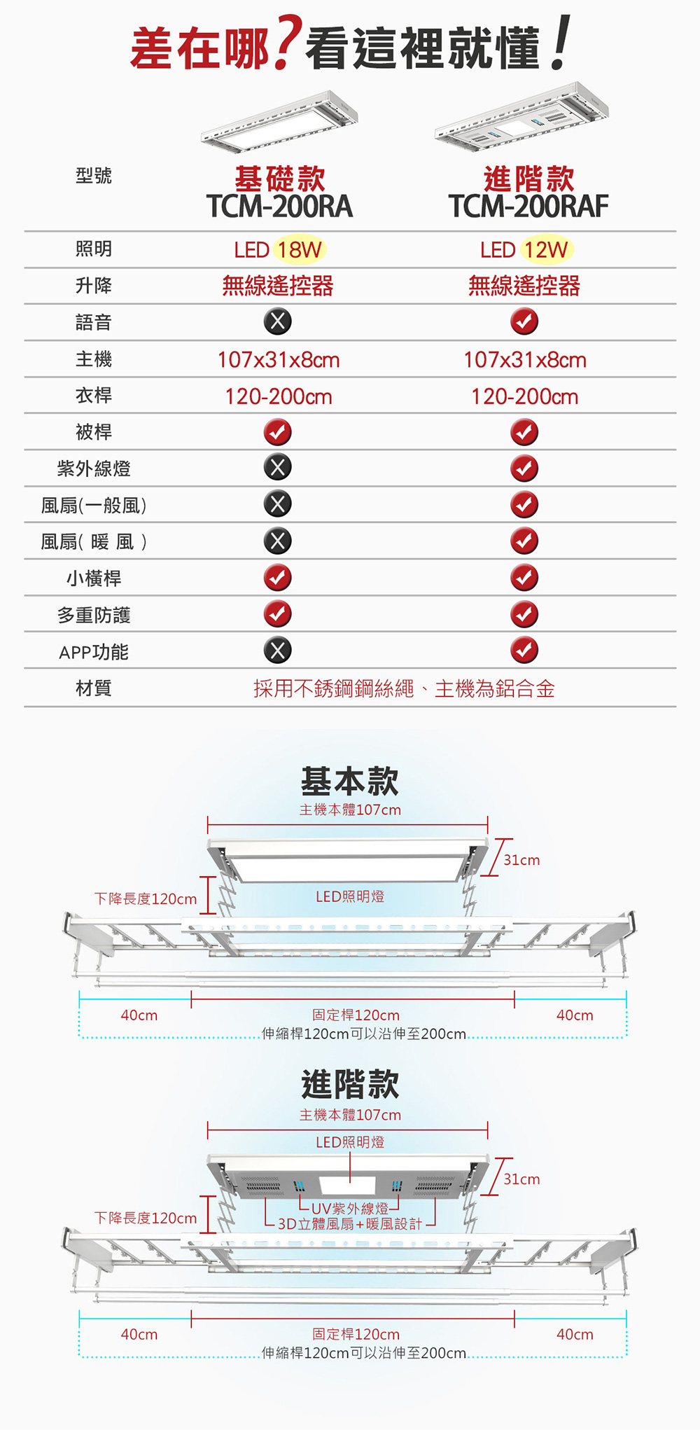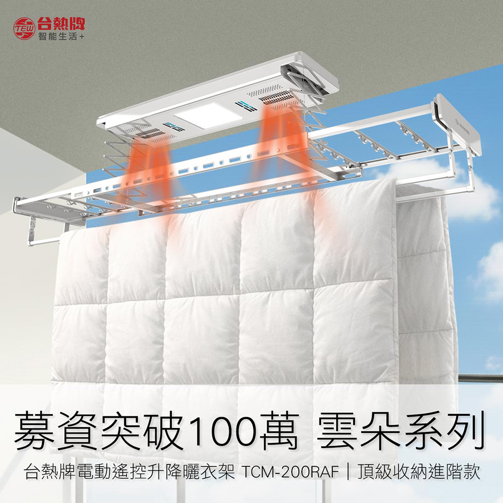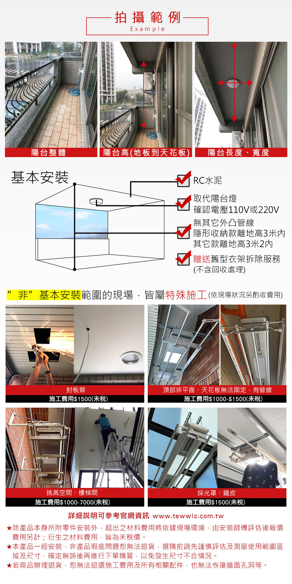 ※本產品為附基本安裝,安裝詳情請見商品頁面說明。各大建設公司、室內裝潢、設計師、飯店民宿指定品牌,爸爸、媽媽、阿公、阿嬤..通通都知道的老字號品牌,【TEW台熱牌萬里晴】台灣在地54年老字號家電品牌,就【TEW台熱牌萬里晴】敢說「不做最多,只做最好!」,產品耐用、品質穩固,家居生活智能化您我生活更便利!多數老屋裝潢,在陽台上也下了許多新意,不再讓陽台雜亂、堆積雜物,大多室內設計師,在陽台上都採用【TEW台熱牌萬里晴】電動遙控升降曬衣機,節省空間、美觀耐用、使用上對屋主來說方便又省電,簡單又實用,下方也能種植花草、美化環境及提升生活品質。這樣的生活是您可以選擇改變~創新科技,智能生活!選用台熱牌萬里晴,讓您輕鬆曬衣好心情!=====商品特色=====◆雲白色處理,高雅又大方。◆語音聲控系統,用"說"的操控曬衣機。◆LED照明燈具,霧柔光線使您倍感溫馨。◆衣桿採用隱藏式收納設計,讓陽台更整潔美觀。◆可伸縮曬衣桿,進口鋁合金輕量化材質,耐磨、抗壓。◆遙控器採用無線數位控制,遙控器本身超薄、高質感。◆全機身採用鋁合金噴砂技術及凝膠電泳技術,高抗氧化處理不易受潮鏽蝕。◆採用高強度材質的不繡鋼304鋼絲繩,表面抗氧化、耐磨損,讓您曬衣更安心。◆平衡結構曬衣技術,採用剪刀型抗風提升架平衡設計,可耐重遠高過家庭使用載重需求。◆UV紫外線燈採用LED燈泡,內崁式安全設計不易撞破,定時30分鐘關閉功能,不會破壞衣物材質。◆智能靜音馬達科技,下降遇障礙物將自動停止,馬達經測試可使用高達100000小時以上,運行安靜穩定且安全。◆每日使用升降2次,照明2小時並開啟風扇及紫外線燈光,消耗電量每日不超過1度電,一個月下來總花費才160元(一度電平均價格為3元),相當節約能源。◆智能風扇立體3D大風輪風乾設計,可切換一般風及PTC陶瓷加熱暖風兩種模式,定時2小時關閉,使周圍空氣產生對流循環,防止衣物發霉變味,加速風乾的同時並改善空氣品質。◆附WIFI遠端遙控功能,iOS與Android手機皆可使用,手機下載APP後完成操作設定,手機即可當電動曬衣機的遙控器使用,隨時隨地操控曬衣機不設限。=====注意事項=====※本產品附基本安裝。※請勿讓機器負荷過載。※請勿讓兒童玩耍或其他用途。※※本產品附基本安裝,但不含配線等五金耗材,若超過本公司安裝區域以外偏遠地區須另收車馬費。※※※本商品採預約方式出貨(直接由生產廠商出貨安裝),訂單成立後 3 個工作天內會與客戶聯繫約定日期(不含週六日及國定假日)。我們所提供為全新產品,並提供以下保證:全系列機型免費保固期長達2年(馬達保固3年)全系列機型均投保產品責任險5000萬。 (本保固卡如遺失,恕不補發,請妥善保管。)下列情形不在保固卡範圍,須酌收工本材料費。1.未依所附之安裝及使用說明施工及使用,或由非專業合格人員安裝而造成之故障。2.附件如遙控器、防風掛勾與消耗品(燈)不屬保固範圍內。3.非本公司認可之修理或擅自改裝者。4.天災地變(含蟲蟻)造成之損壞。5.一切人為因素造成之損壞。◎基本安裝(一般RC水泥牆面),其餘屬特殊安裝。◎商品文案由原廠商所提供,若有變動敬請參照實際商品為準。◎商品可能因拍攝產生色差,圖片僅供參考,商品依實際供貨樣式為準。◎影音僅提供產品使用操作參考,影片產品內容物不代表實際出貨物,商品依實際供貨樣式為準。◎送貨及安裝時間:週一至週五,安裝人員會與客戶電話聯絡聯繫確認安裝時間,不含舊機回收處理。◎除產品本身所附零件安裝外,超出之材料費用將依據現場環境由安裝師傅評估後報價費用另計;現場安裝施工所衍生之其他費用,恕無法另行開立發票。◎本產品一經安裝,非產品瑕疵問題恕無法退貨,選購前請先謹慎評估及測量使用範圍區域及尺寸,確定無誤後再進行下單購買,以免發生尺寸不合情況。若有疑慮可以撥打諮詢專線0800-364-555。◎本產品由生產廠商免費提供基本運送,若因地處偏遠或其他特殊情形 (例如:天災或道路狀況不良),導致物流車輛無法於正常狀況下送抵,則需以其他方式處理時,所衍生之費用須由訂購人自行支付供貨廠商。 ◆商品:【台熱牌 TEW】萬里晴電動遙控升降曬衣機/架(TCM-200RAF/頂級收納進階款)(附基本安裝)◆配件:說明書保固卡、無線遙控器◆尺寸:107cm/31cm/8cm(±5%)◆桿長:120cm可延伸至200cm◆衣桿:伸縮桿x4◆升降高度:120cm(建議高度300公分)◆重量:13kg(±5%)◆電壓:110V/60Hz;220V/50Hz(可挑) ◆承載:35kg(±5%)◆顏色:白色◆材質:鋁合金◆產地:中國(台灣監製)◆使用方式:請依說明書內容詳細標示