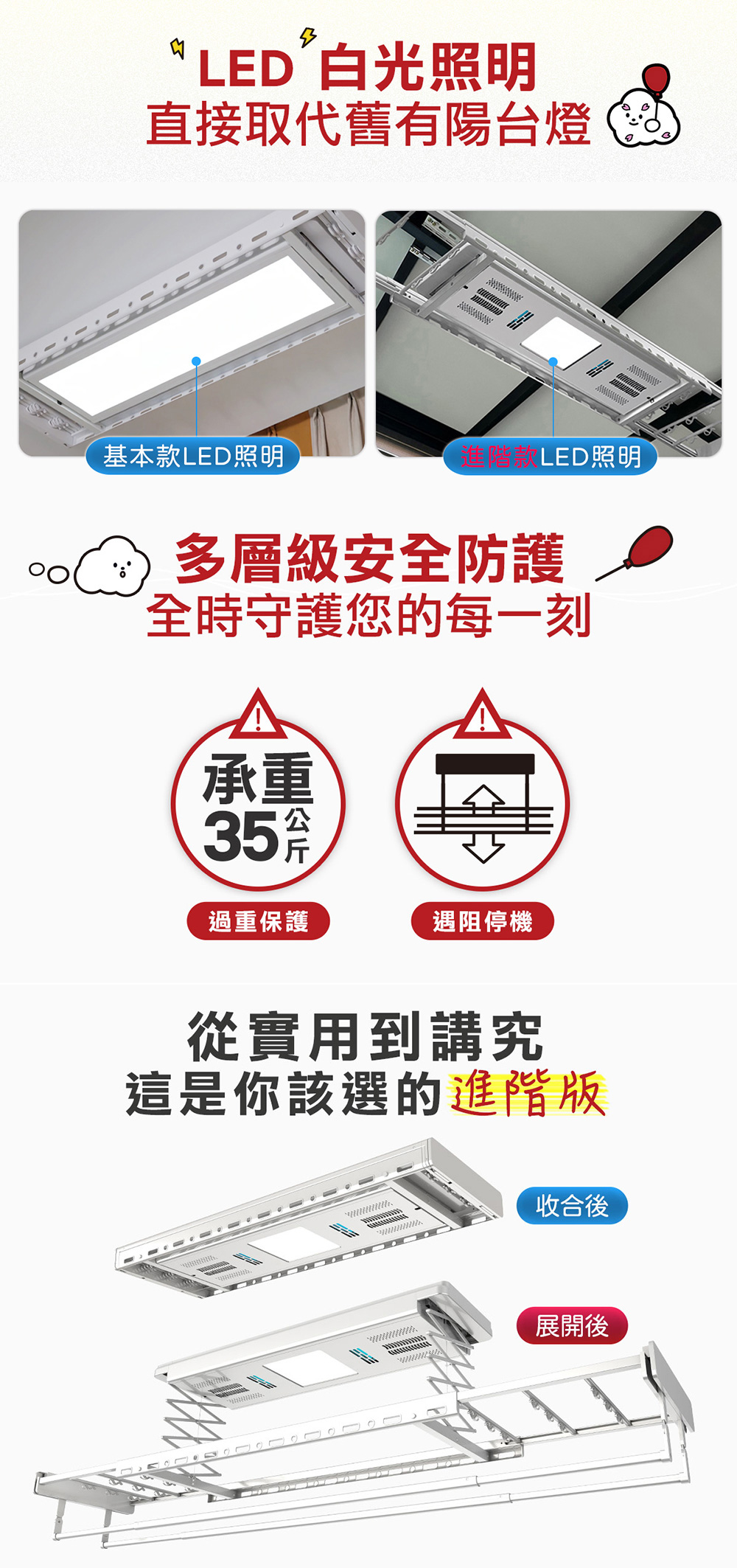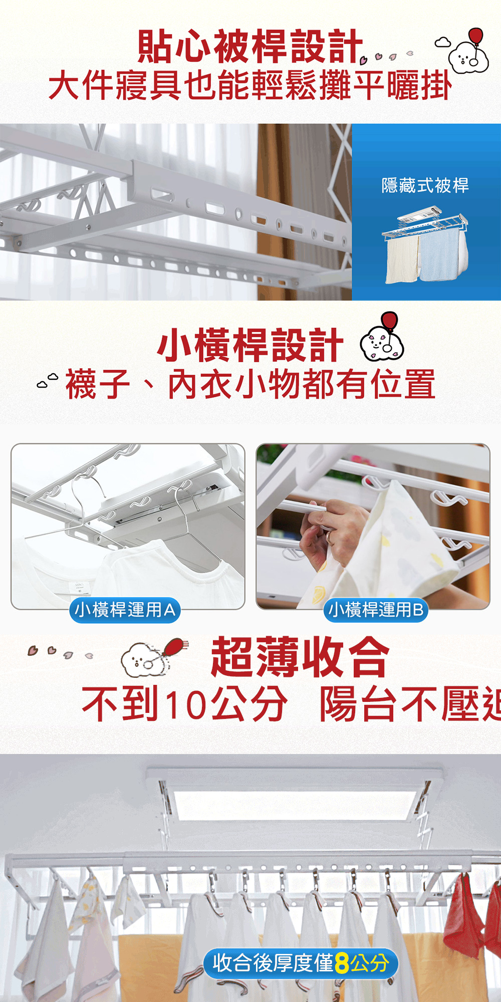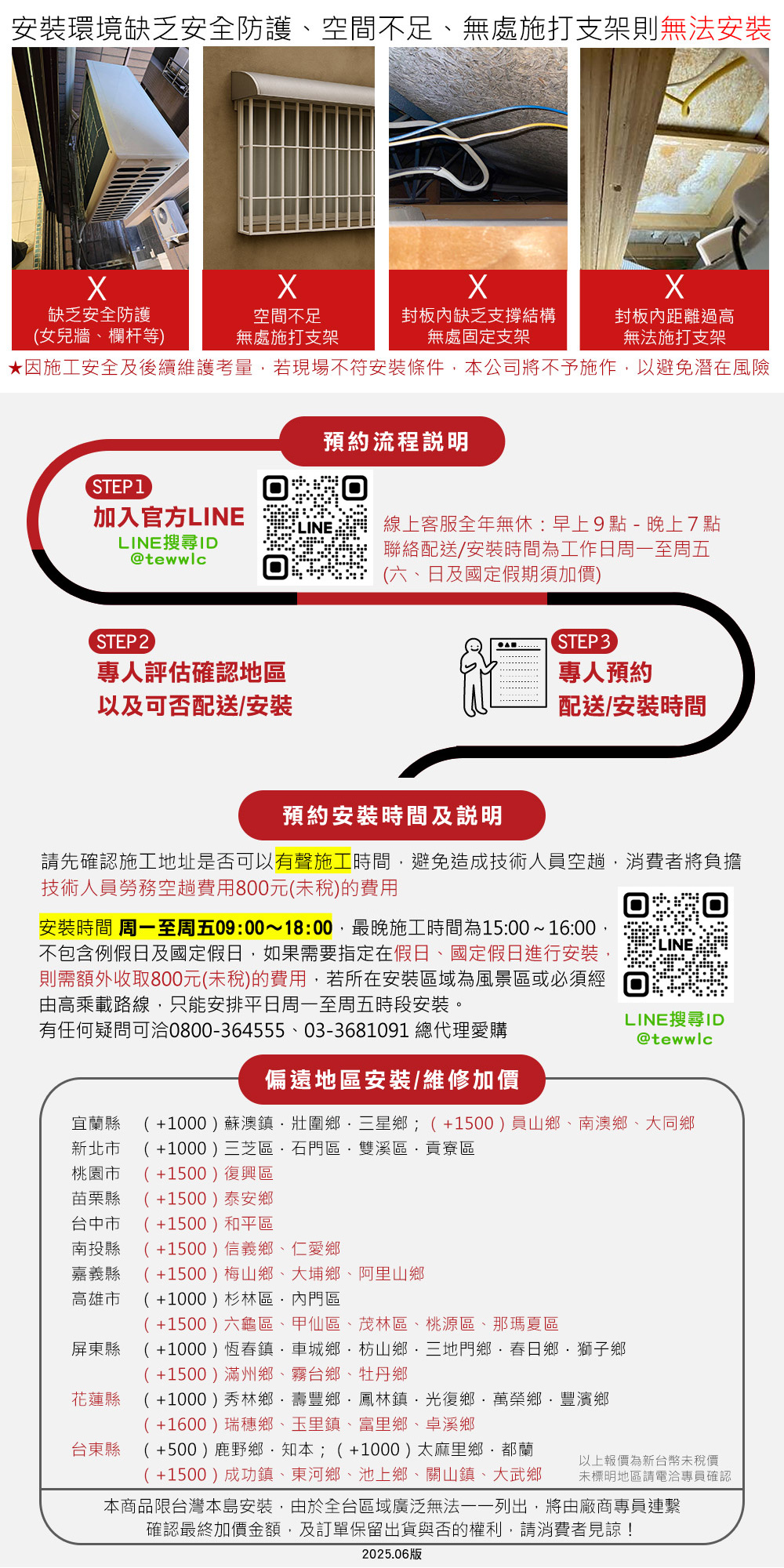 ※本產品為附基本安裝,安裝詳情請見商品頁面說明。各大建設公司、室內裝潢、設計師、飯店民宿指定品牌,爸爸、媽媽、阿公、阿嬤..通通都知道的老字號品牌,【TEW台熱牌萬里晴】台灣在地54年老字號家電品牌,就【TEW台熱牌萬里晴】敢說「不做最多,只做最好!」,產品耐用、品質穩固,家居生活智能化您我生活更便利!多數老屋裝潢,在陽台上也下了許多新意,不再讓陽台雜亂、堆積雜物,大多室內設計師,在陽台上都採用【TEW台熱牌萬里晴】電動遙控升降曬衣機,節省空間、美觀耐用、使用上對屋主來說方便又省電,簡單又實用,下方也能種植花草、美化環境及提升生活品質。這樣的生活是您可以選擇改變~創新科技,智能生活!選用台熱牌萬里晴,讓您輕鬆曬衣好心情!=====商品特色=====◆雲白色處理,高雅又大方。◆語音聲控系統,用"說"的操控曬衣機。◆LED照明燈具,霧柔光線使您倍感溫馨。◆衣桿採用隱藏式收納設計,讓陽台更整潔美觀。◆可伸縮曬衣桿,進口鋁合金輕量化材質,耐磨、抗壓。◆遙控器採用無線數位控制,遙控器本身超薄、高質感。◆全機身採用鋁合金噴砂技術及凝膠電泳技術,高抗氧化處理不易受潮鏽蝕。◆採用高強度材質的不繡鋼304鋼絲繩,表面抗氧化、耐磨損,讓您曬衣更安心。◆平衡結構曬衣技術,採用剪刀型抗風提升架平衡設計,可耐重遠高過家庭使用載重需求。◆UV紫外線燈採用LED燈泡,內崁式安全設計不易撞破,定時30分鐘關閉功能,不會破壞衣物材質。◆智能靜音馬達科技,下降遇障礙物將自動停止,馬達經測試可使用高達100000小時以上,運行安靜穩定且安全。◆每日使用升降2次,照明2小時並開啟風扇及紫外線燈光,消耗電量每日不超過1度電,一個月下來總花費才160元(一度電平均價格為3元),相當節約能源。◆智能風扇立體3D大風輪風乾設計,可切換一般風及PTC陶瓷加熱暖風兩種模式,定時2小時關閉,使周圍空氣產生對流循環,防止衣物發霉變味,加速風乾的同時並改善空氣品質。◆附WIFI遠端遙控功能,iOS與Android手機皆可使用,手機下載APP後完成操作設定,手機即可當電動曬衣機的遙控器使用,隨時隨地操控曬衣機不設限。=====注意事項=====※本產品附基本安裝。※請勿讓機器負荷過載。※請勿讓兒童玩耍或其他用途。※※本產品附基本安裝,但不含配線等五金耗材,若超過本公司安裝區域以外偏遠地區須另收車馬費。※※※本商品採預約方式出貨(直接由生產廠商出貨安裝),訂單成立後 3 個工作天內會與客戶聯繫約定日期(不含週六日及國定假日)。我們所提供為全新產品,並提供以下保證:全系列機型免費保固期長達2年(馬達保固3年)全系列機型均投保產品責任險5000萬。 (本保固卡如遺失,恕不補發,請妥善保管。)下列情形不在保固卡範圍,須酌收工本材料費。1.未依所附之安裝及使用說明施工及使用,或由非專業合格人員安裝而造成之故障。2.附件如遙控器、防風掛勾與消耗品(燈)不屬保固範圍內。3.非本公司認可之修理或擅自改裝者。4.天災地變(含蟲蟻)造成之損壞。5.一切人為因素造成之損壞。◎基本安裝(一般RC水泥牆面),其餘屬特殊安裝。◎商品文案由原廠商所提供,若有變動敬請參照實際商品為準。◎商品可能因拍攝產生色差,圖片僅供參考,商品依實際供貨樣式為準。◎影音僅提供產品使用操作參考,影片產品內容物不代表實際出貨物,商品依實際供貨樣式為準。◎送貨及安裝時間:週一至週五,安裝人員會與客戶電話聯絡聯繫確認安裝時間,不含舊機回收處理。◎除產品本身所附零件安裝外,超出之材料費用將依據現場環境由安裝師傅評估後報價費用另計;現場安裝施工所衍生之其他費用,恕無法另行開立發票。◎本產品一經安裝,非產品瑕疵問題恕無法退貨,選購前請先謹慎評估及測量使用範圍區域及尺寸,確定無誤後再進行下單購買,以免發生尺寸不合情況。若有疑慮可以撥打諮詢專線0800-364-555。◎本產品由生產廠商免費提供基本運送,若因地處偏遠或其他特殊情形 (例如:天災或道路狀況不良),導致物流車輛無法於正常狀況下送抵,則需以其他方式處理時,所衍生之費用須由訂購人自行支付供貨廠商。 ◆商品:【台熱牌 TEW】萬里晴電動遙控升降曬衣機/架(TCM-200RAF/頂級收納進階款)(附基本安裝)◆配件:說明書保固卡、無線遙控器◆尺寸:107cm/31cm/8cm(±5%)◆桿長:120cm可延伸至200cm◆衣桿:伸縮桿x4◆升降高度:120cm(建議高度300公分)◆重量:13kg(±5%)◆電壓:110V/60Hz;220V/50Hz(可挑) ◆承載:35kg(±5%)◆顏色:白色◆材質:鋁合金◆產地:中國(台灣監製)◆使用方式:請依說明書內容詳細標示