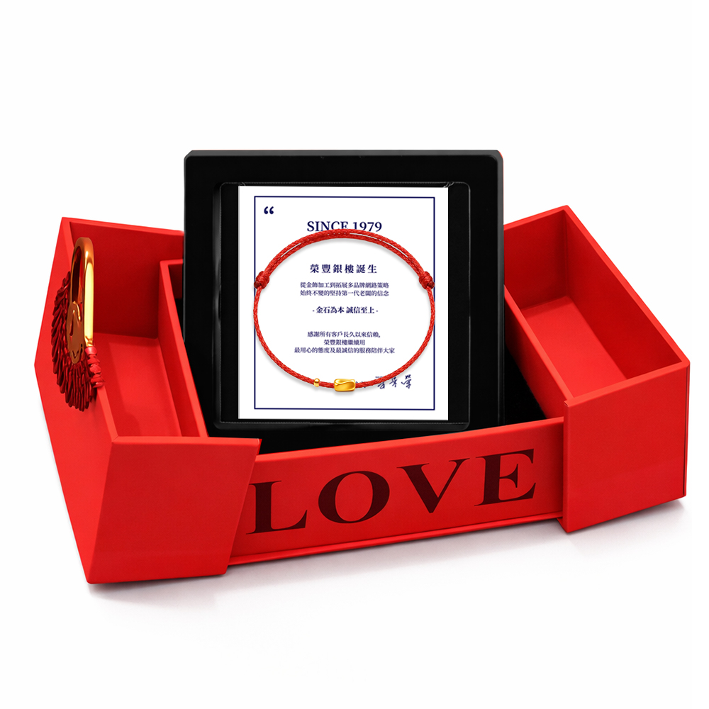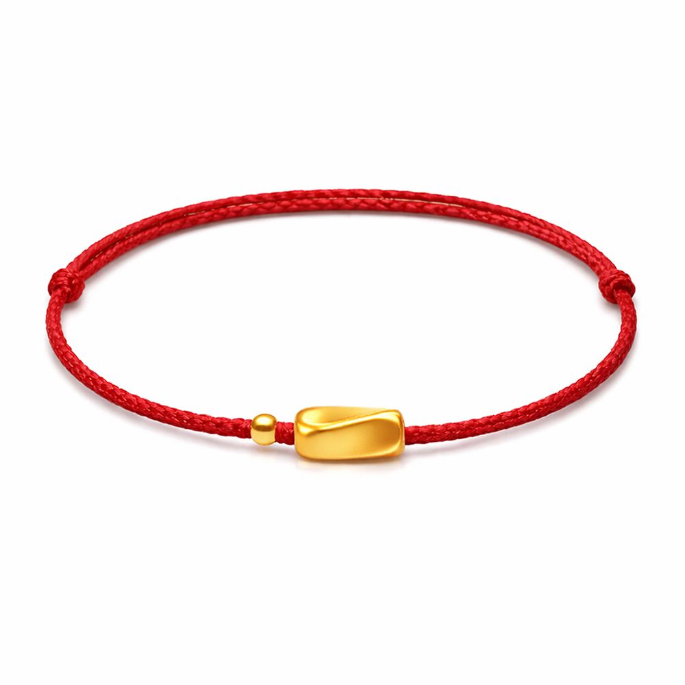 重量:黃金約重0.05錢±0.01材質:純金+紅繩尺寸:如實品;手繩周長約為23cm,可自由調節,男女皆可配戴配件:包裝盒x1、保證卡x1、手提袋x1