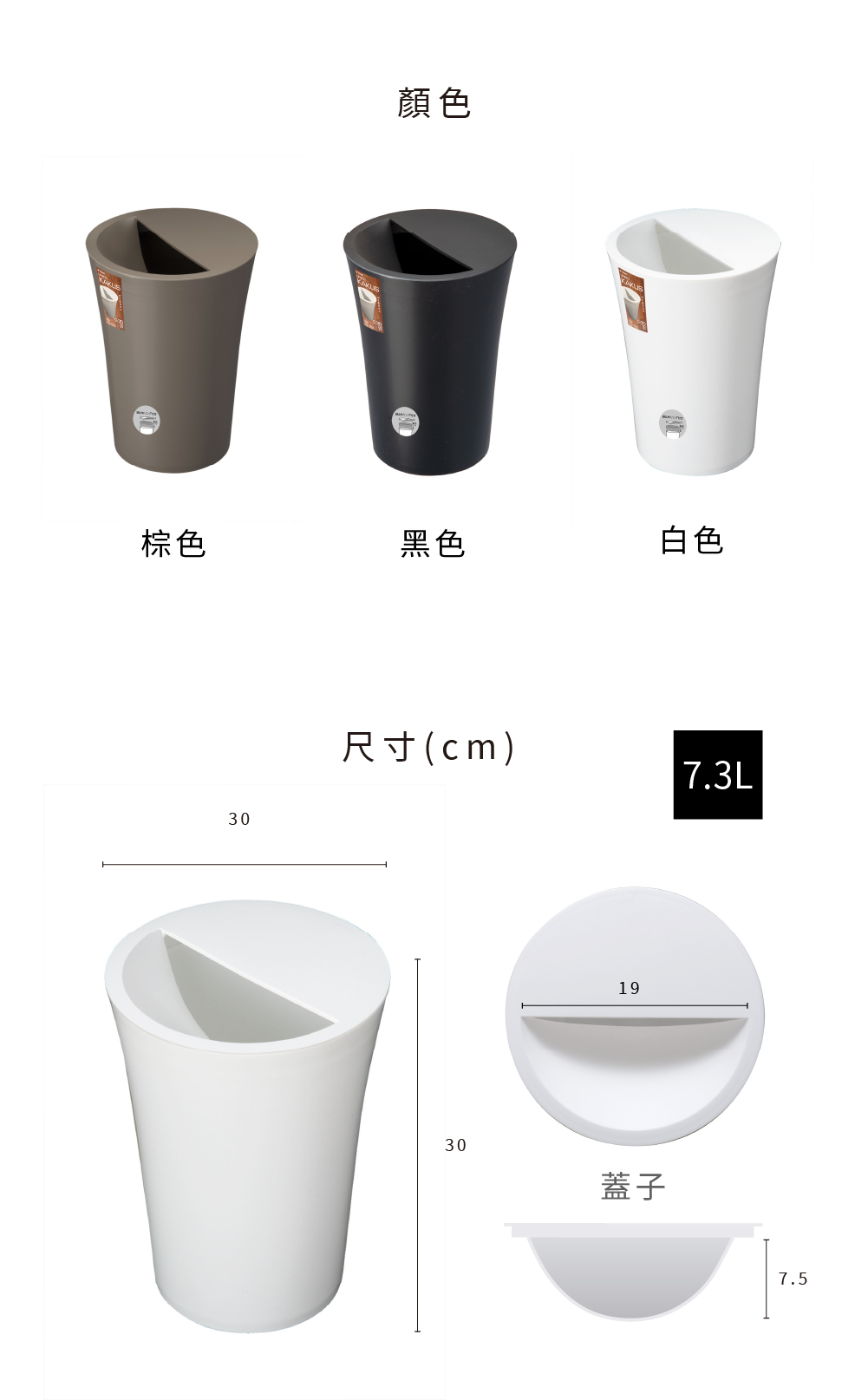 半開口設計,擁有高方便性及隱密性上蓋為斜角設計,讓您從頂部也看不到垃圾將輕巧的上蓋打開後,亦可丟棄較大型垃圾尺寸:φ22×高度30 cm材質:PP容量:7.3L重量:0.25Kg原產地:日本
