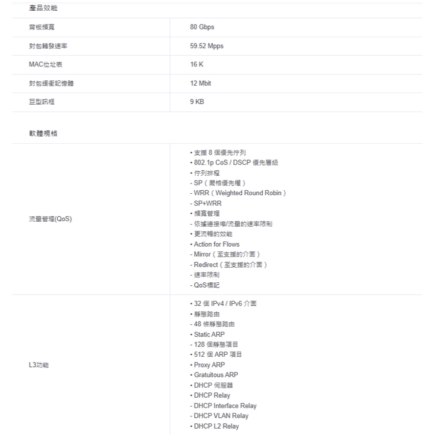 -適用於WiFi 6的2.5G PoE+連接埠:8× 2.5 Gbps連接埠突破Gigabit限制,釋放 WiFi 6 AP的全部潛力。-10G快如閃電的連線:2× 10 Gbps SFP+插槽可實現高頻寬連線和無壅塞的交換容量。-240 W PoE總供電:8×相容 802.3at/af PoE+連接埠,總供電達240 W*。-集中雲端管理:整合至 Omada SDN中,實現零接觸設定(ZTP)、雲端存取、遠端管理和多站點管理。-靜態路由:幫助路由內部流量,更有效地使用網路資源。-強大的安全性策略:IP-MAC-Port Binding、ACL、連接埠安全性、DoS 防禦、風暴控制、DHCP Snooping、802.1X、Radius驗證等。-優化語音和視訊應用:L2 / L3 / L4 QoS 和 IGMP Snooping。