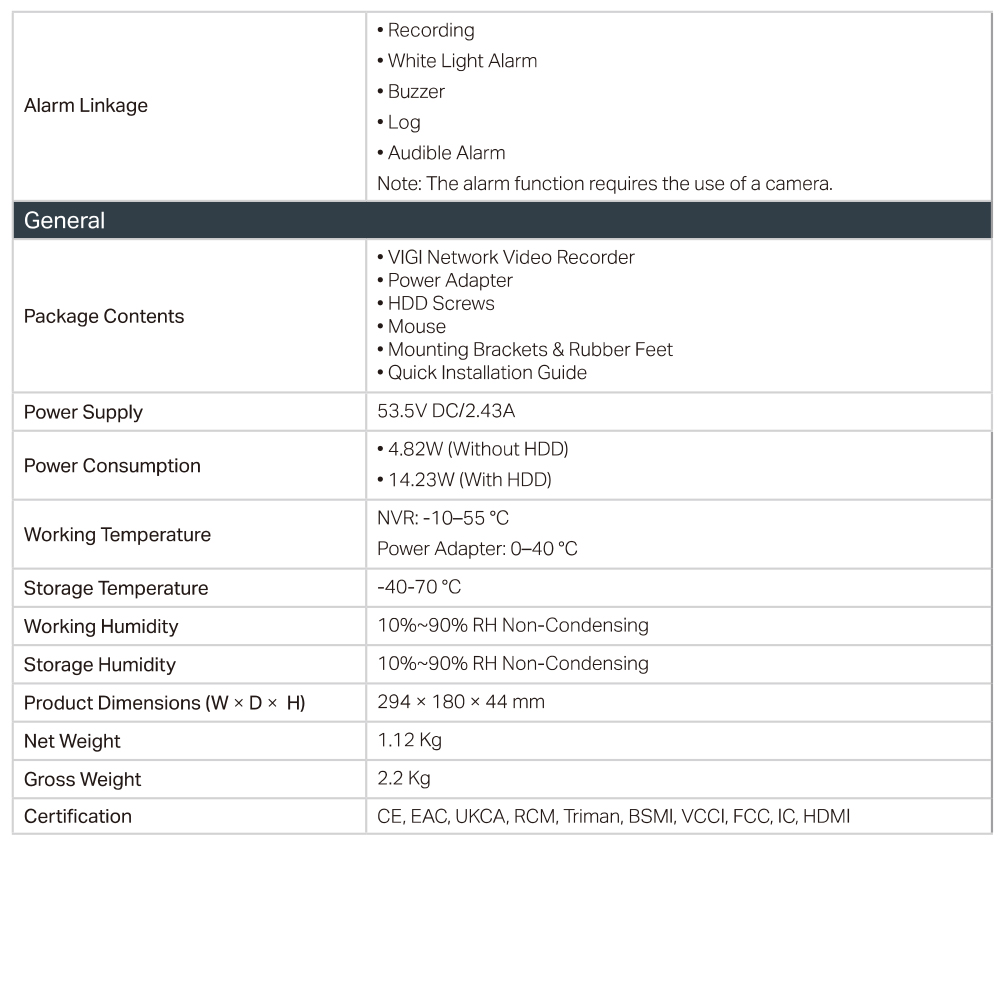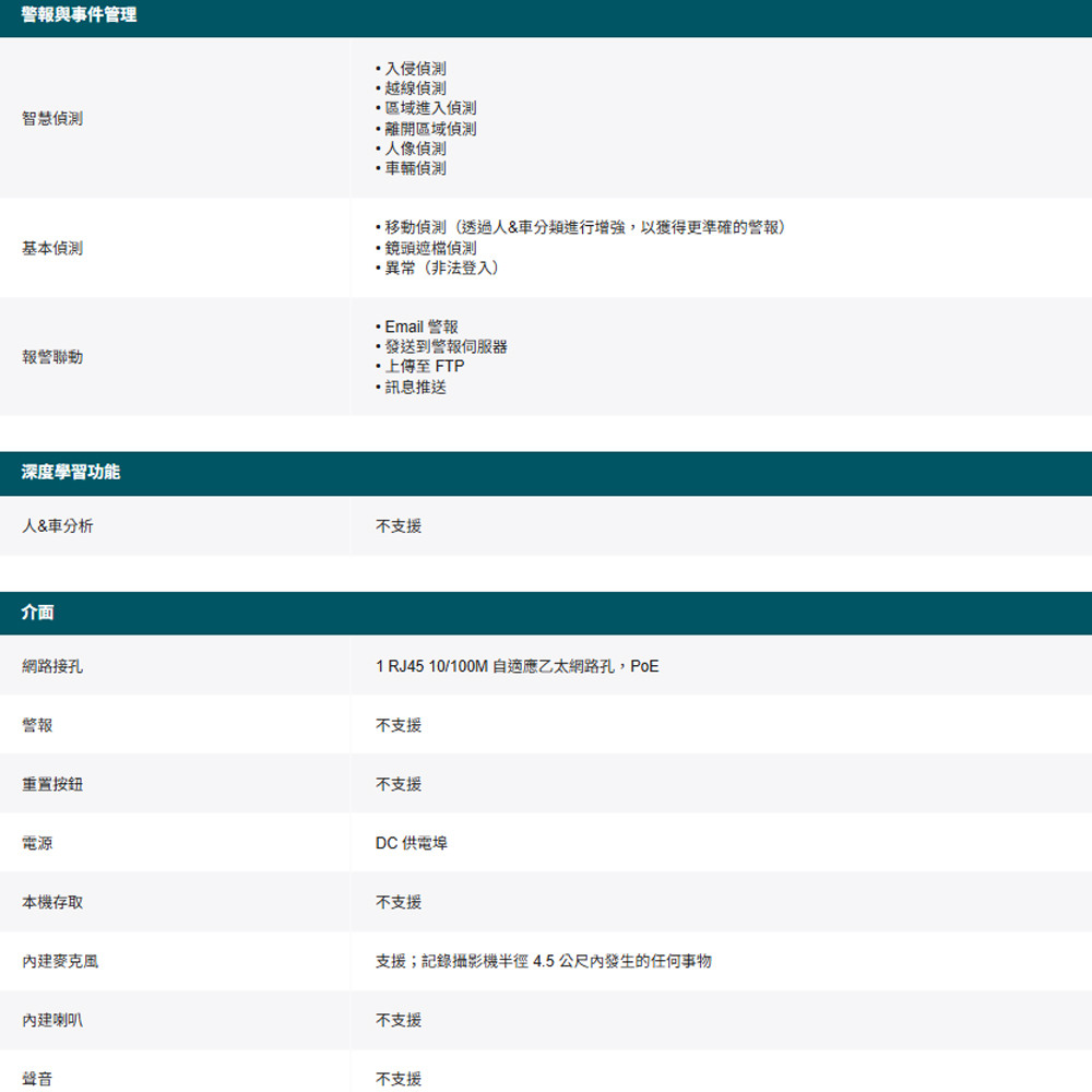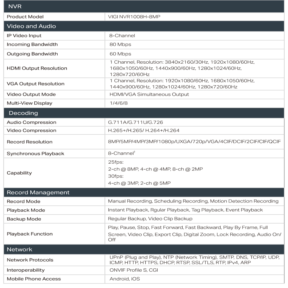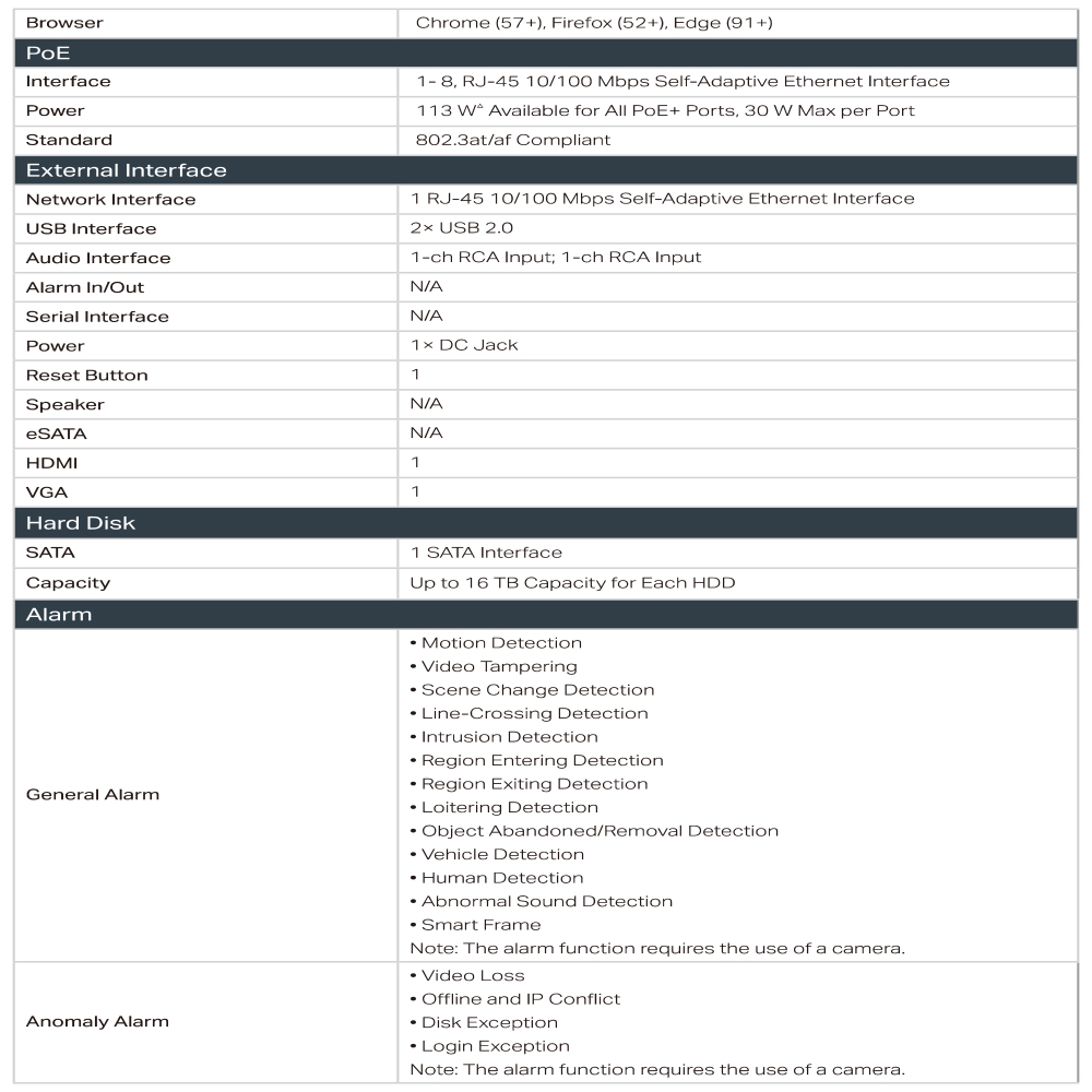 S3252MP 高畫素 和 24h 全彩LightPro 夜視人 & 車分類智慧偵測智慧影像強化技術內建麥克風IP67 防水防塵H.265+ 壓縮技術NVR1008H-8MP8 路即時畫面與 4K HDMI 影像輸出8× 10/100 Mbps PoE+ 連接埠,113 W PoE 總功率△高達 8 路 @ 2MP (25fps) / 4 路 @ 4MP (25fps) 解碼能力8 路同時回放†80 Mbps 輸入頻寬和 60 Mbps 輸出頻寬1 個 SATA介面,最高支援 16 TB *H.265+ 壓縮技術HDMI 和 VGA 同時輸出遠端監控
