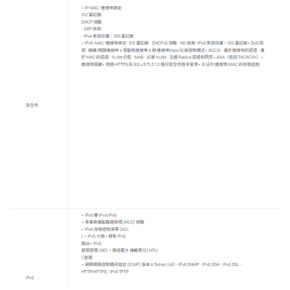 -強大的安全性策略:IP-MAC-連接埠綁定、ACL、連接埠安全、DoS防禦、風暴控制、DHCP偵聽、802.1X、Radius驗證等。