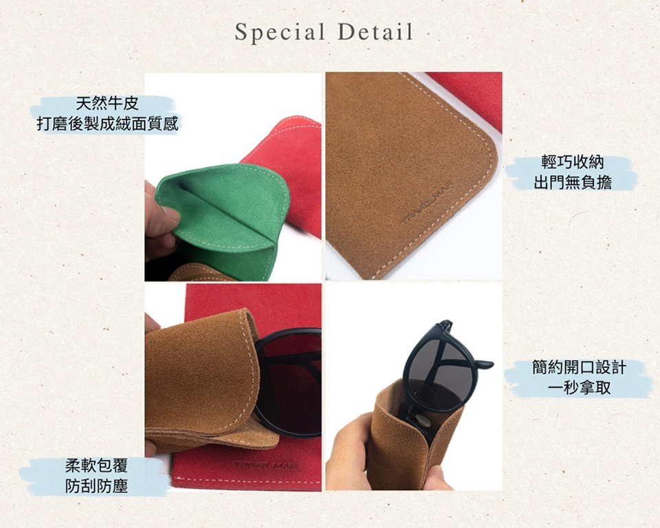 ➤ 天然牛皮,頂級觸感嚴選真皮材質,呈現霧面細絨質感,手感溫潤且不易留指紋➤ 柔軟包覆,全面防護內裡質地柔軟,有效防刮防塵➤ 一秒拿取,極簡開口無拉鍊、無扣件的簡約開口設計,讓您能快速且優雅地拿取鏡片➤ 輕巧收納,出門無負擔極薄扁平化設計,不佔包內空間,實踐輕簡生活的隨行美學