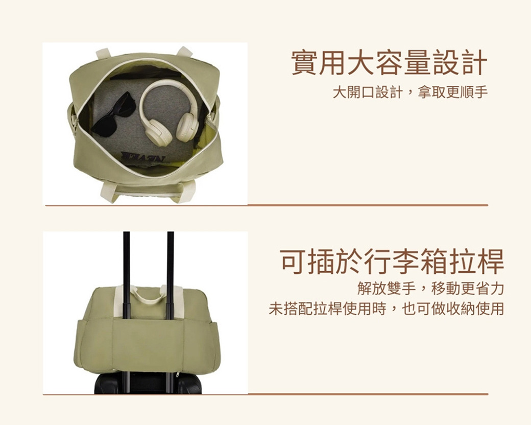 行李箱插杆設計:背面專屬插槽可固定於行李箱拉桿,釋放雙手負擔,讓移動過程更流暢優雅。不搭配拉桿時,也可作為收納袋使用。