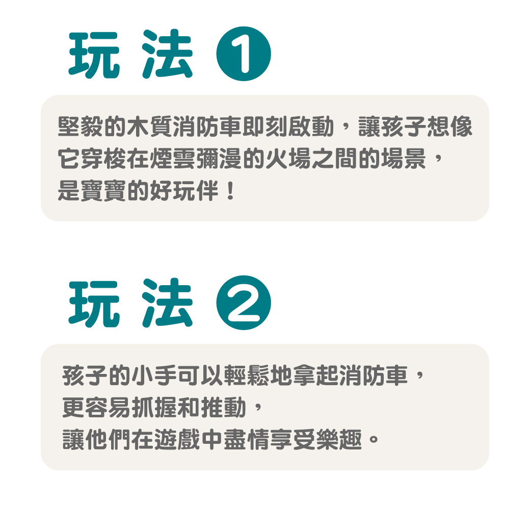 (同款任選購買"2個"以上出貨)尺寸:13.4x5.4x9.2cm重量:177g材質:中密度纖維板(MDF)、木頭產地:中國●當火光蔓延,一輛堅毅的木質消防車即刻啟動,奮戰在煙雲彌漫的火場之間,是救助於水火中的好夥伴!●可從窗邊的小洞,帶著木質消防車前往救援,訓練手部小肌肉●學習主題:手部肌肉/形狀/角色扮演