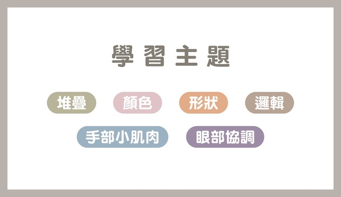 ●學習主題:眼部協調/手部小肌肉/形狀/顏色/堆疊/邏輯