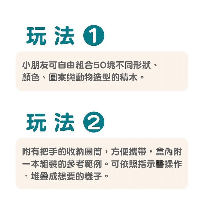 ●堆疊過程中,孩子不僅培養手眼協調、精細動作,還能認識形狀與顏色,訓練邏輯思考與創造力。