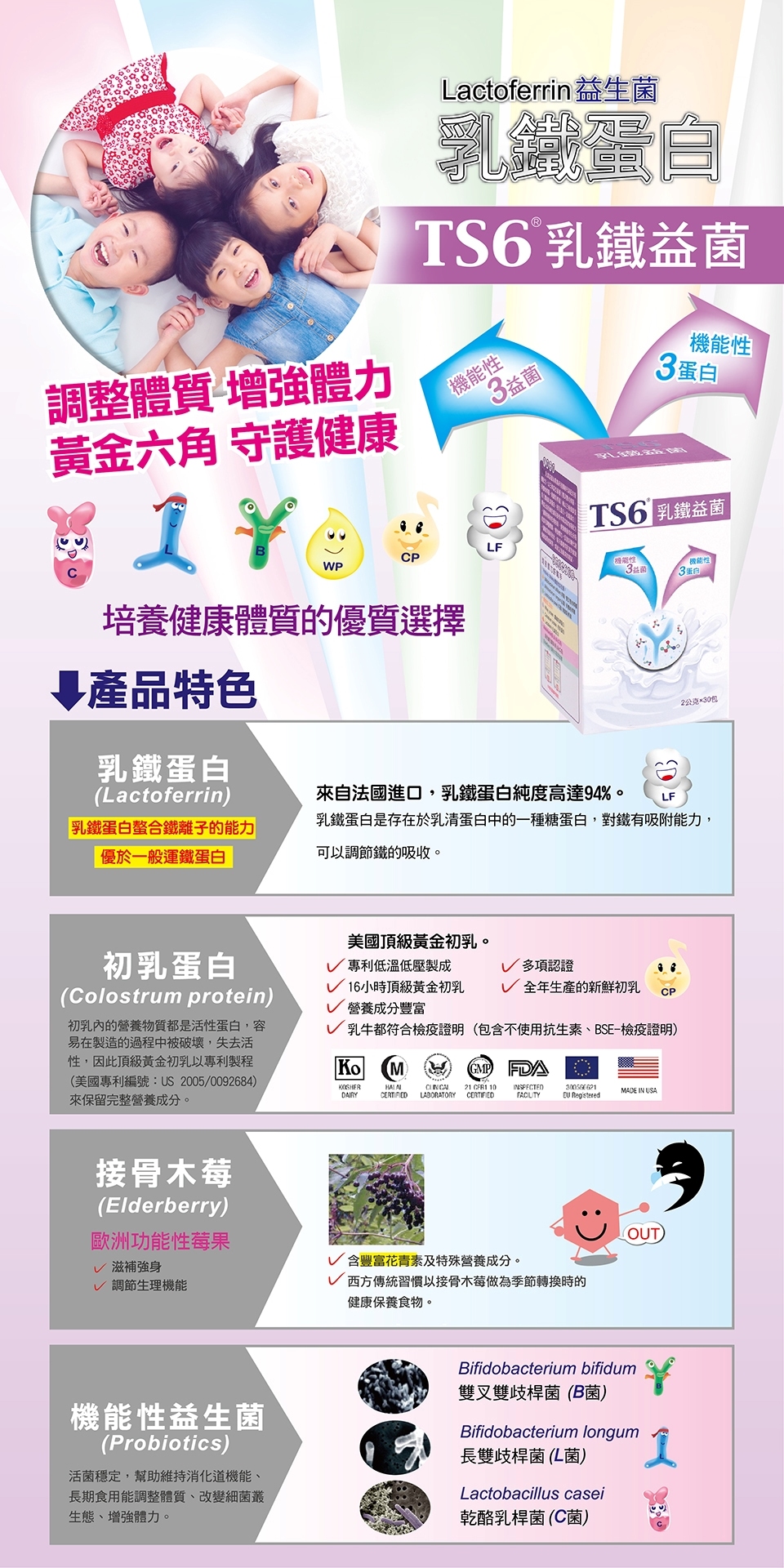 乳糖、麥芽糊精、益生菌: Bifidobacterium bifidum 雙叉雙歧桿菌(B菌) Bifidobacterium longum 長雙歧桿菌(L菌) Lactobacillus casei 乾酪乳桿菌(C菌) 蔗糖、草莓果汁粉、寡糖、機能性三蛋白: Whey protein濃縮乳清蛋白 Colostrum protein初乳蛋白 Lactoferrin 乳鐵蛋白 綜合維生素(B2,B3, B6, C, E)、接骨木莓萃取物、檸檬酸
