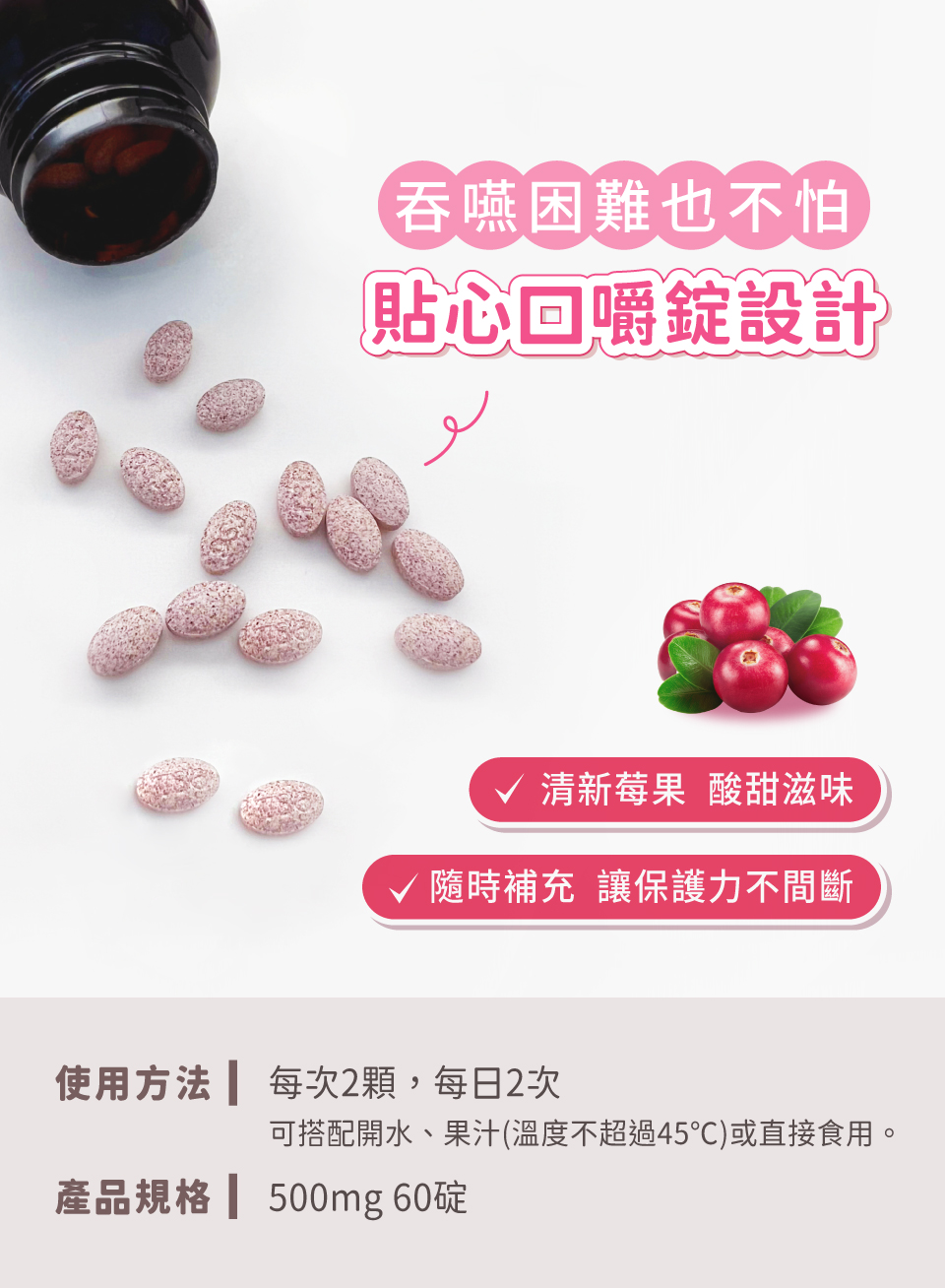 ■產品名稱:TS6美莓優菌C PLUS+ 60顆/盒■產品規格:0.5克 / 60顆■產品成份:乳糖、麥芽糊精、D-甘露糖私密益菌精華:鮮奶發酵 Fresh milk fermentation嗜酸乳桿菌 Lactobacillus acidophilus乾酪乳桿菌 Lactobacillus casei蔓越莓果汁粉(砂糖、阿拉伯膠、檸檬酸、麥芽糊精、蔓越莓濃縮汁、洛神花萃取粉、DL-蘋果酸、檸檬酸鈉、香料)、蔓越莓粉、果寡醣、蔗糖(糖粉)、微晶纖維素、無水檸檬酸、維生素C、葡萄籽萃取物、洛神花萃取物、巴西莓萃取物、硬脂酸鎂、二氧化矽、葡萄香料(香料、三乙酸甘油酯)、蔗糖素(甜味劑)■使用方法:每日2顆,每日2次‧飯後食用,可搭配開水、果汁(溫度不超過45℃),或直接食用。■保存方式:請置於陰涼乾燥通風處,避免高溫及日光直接照射。■保存期限:2年(置於陰涼乾燥處保存)■生產地區:台灣■注意事項:1.請置於陰涼處,避免陽光曝曬。(開封後請於二個月內盡快食用完畢。)2.本產品含有天然植物多酚,開封後請盡速食用完畢,若有顏色變化或斑點本屬自然的正常現象,請安心食用。3.本產品含牛奶及乳糖。4.一日請勿超過10顆。多食無益。