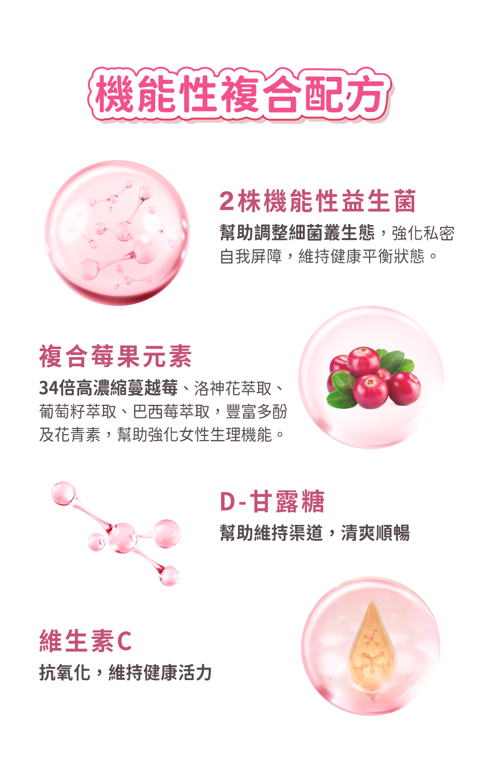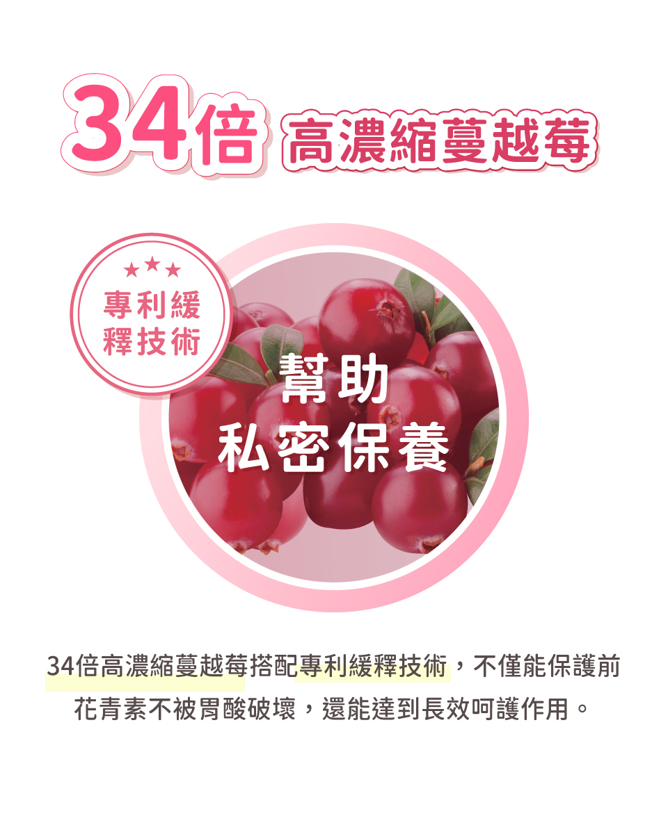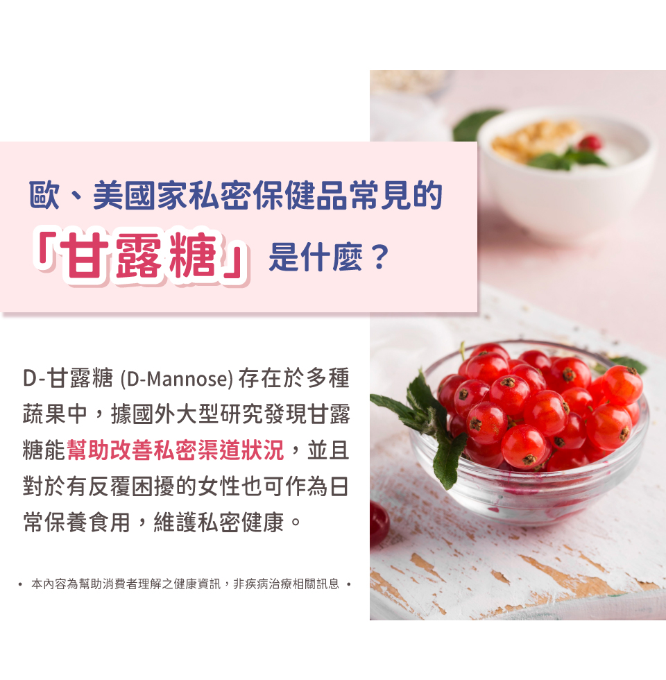 乳糖、麥芽糊精、D-甘露糖 私密益菌精華: 鮮奶發酵 Fresh milk fermentation 嗜酸乳桿菌 Lactobacillus acidophilus 乾酪乳桿菌 Lactobacillus casei 蔓越莓果汁粉(砂糖、阿拉伯膠、檸檬酸、麥芽糊精、蔓越莓濃縮汁、洛神花萃取粉、DL-蘋果酸、檸檬酸鈉、香料)、蔓越莓粉、果寡醣、蔗糖(糖粉)、微晶纖維素、 無水檸檬酸、維生素C、葡萄籽萃取物、洛神花萃取物、巴西莓萃取物、硬脂酸鎂、二氧化矽、葡萄香料(香料、三乙酸甘油酯)、蔗糖素(甜味劑)