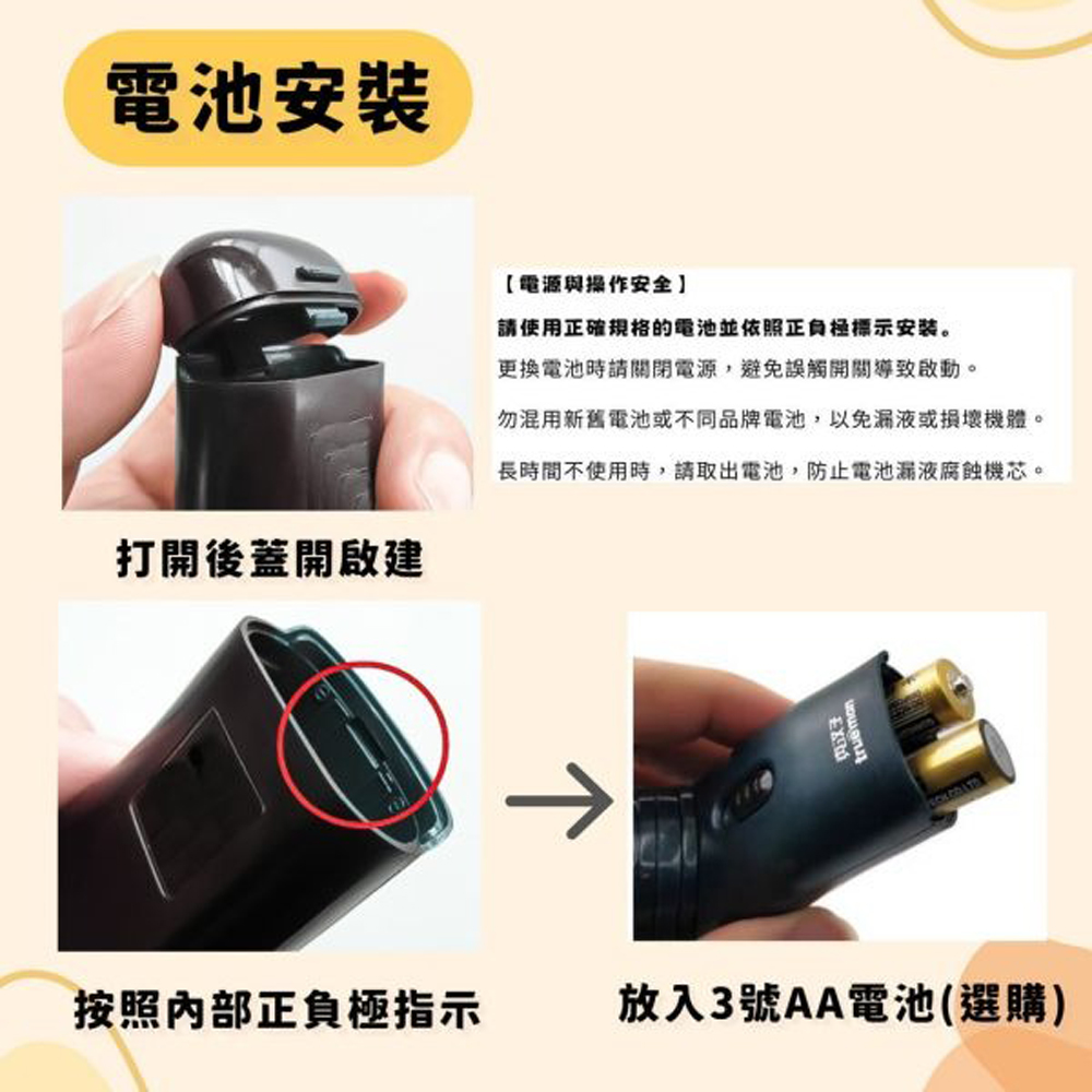 請使用正確規格的電池3號AA 並依照正負極標示安裝。