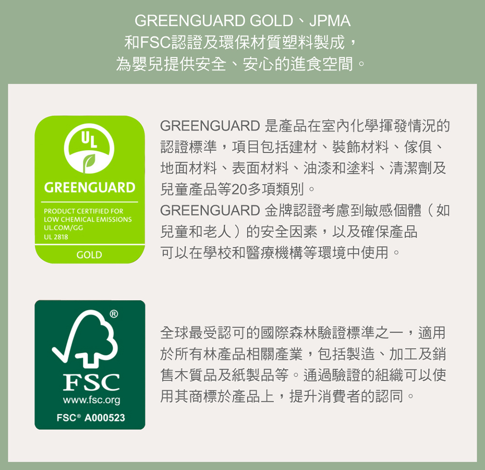 餐盤能輕鬆拆除或安裝,且適用洗碗機清洗●兩段式180度快速調節旋轉腳踏板,讓雙腳能舒適擺放●餐椅後方附有多功能掛勾●質感的色系,讓家中擺設更增添時尚感●高腳餐椅通過GREENGUARD® Gold、JPMA 和FSC® 認證