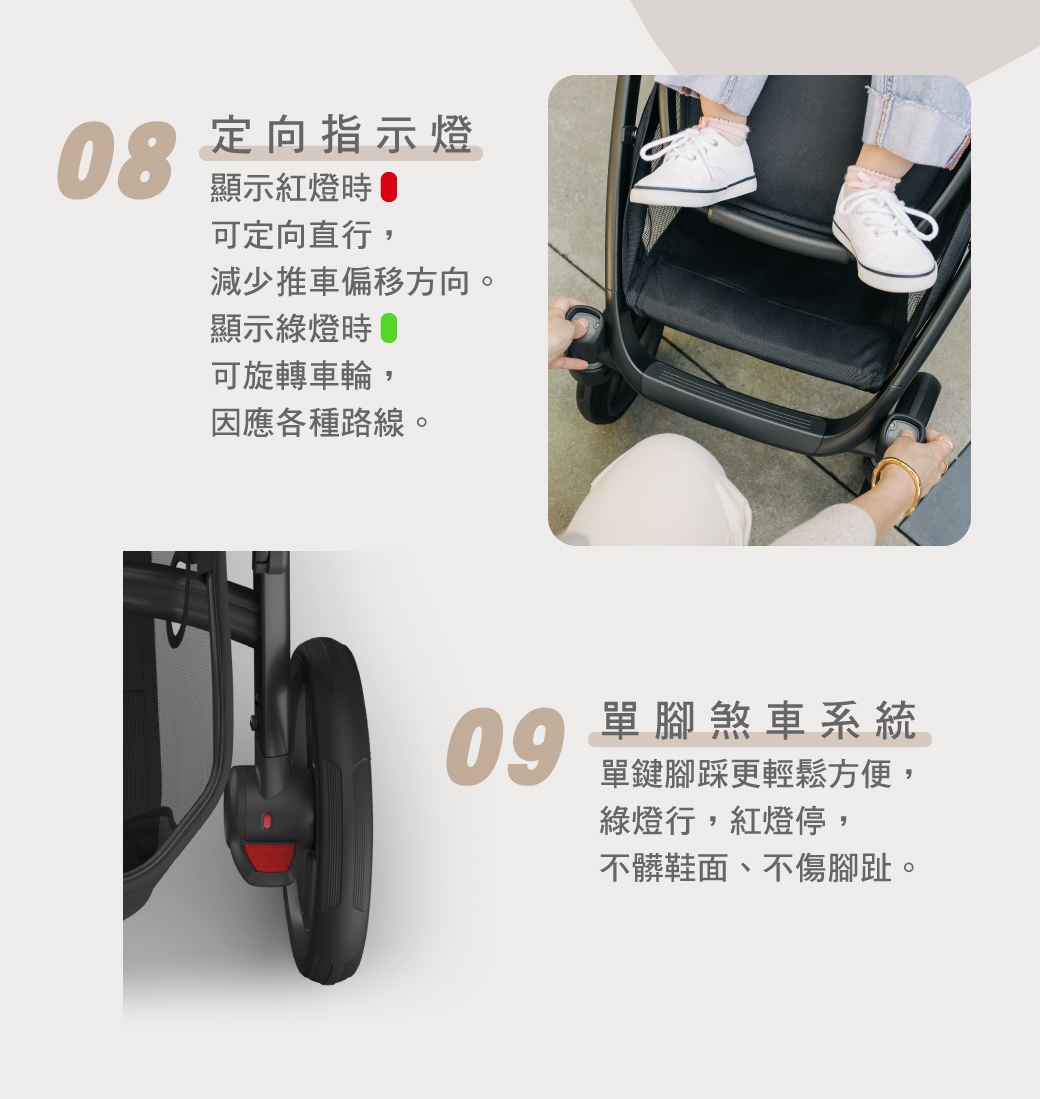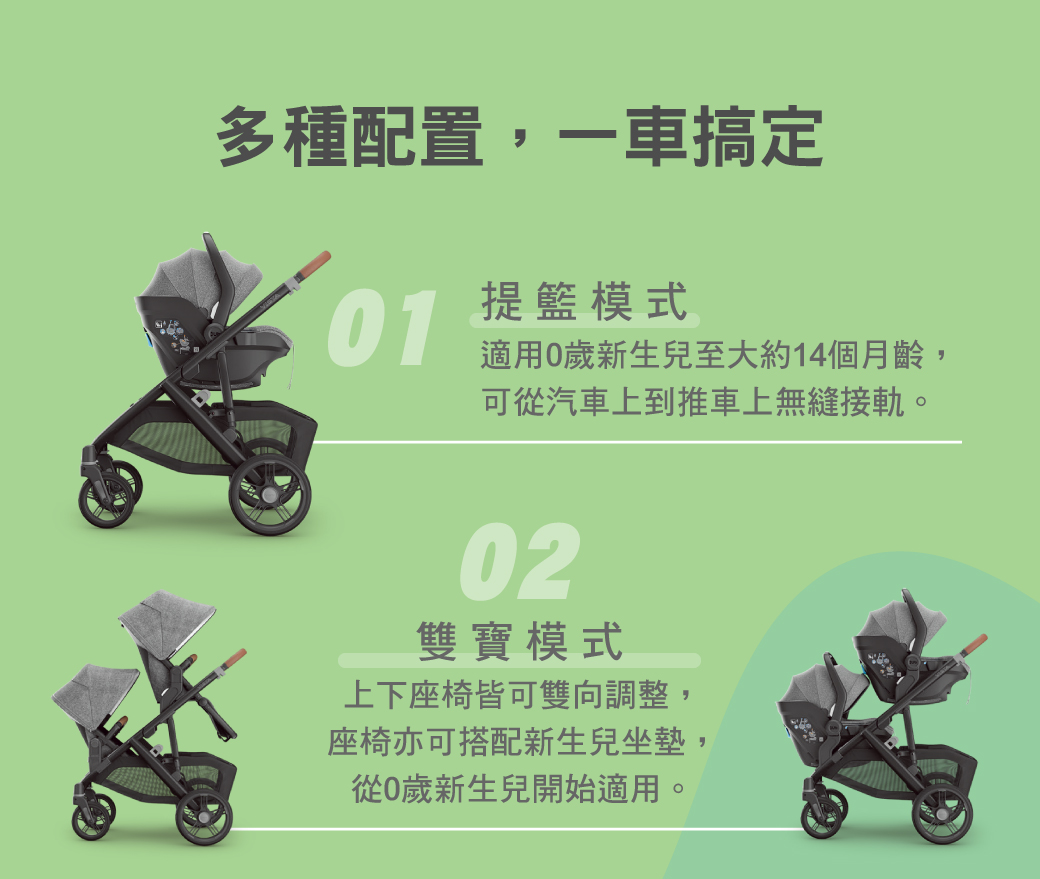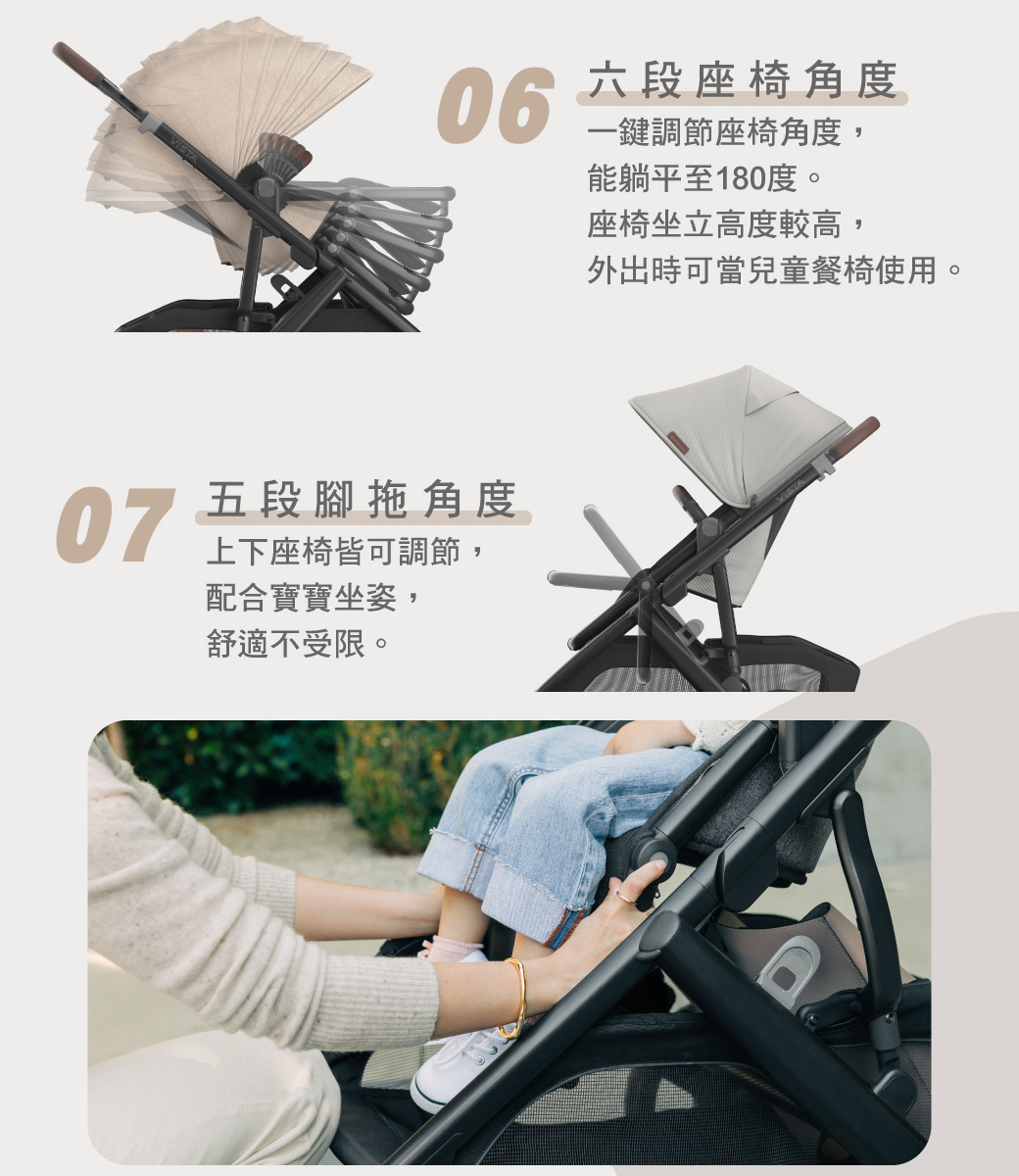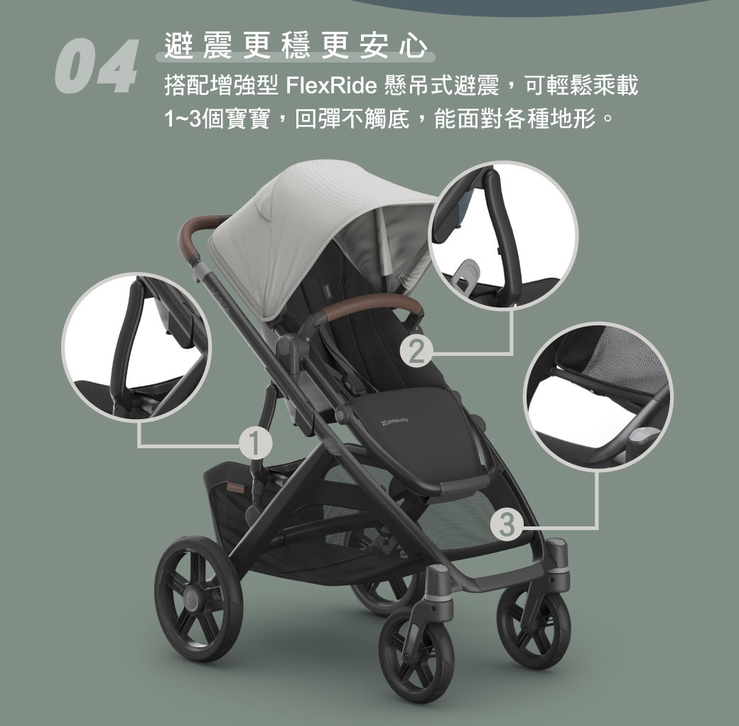全面升級 | 全新體驗●全天候舒適座椅後背採用透氣式網布設計,同時配有可拆卸椅墊,能對應不同溫度及氣候更換。●避震強化再提升大尺寸輪胎,搭配FlexRide懸吊式避震,回彈不觸底。輕鬆乘載1-3個寶寶,面對各種地形不顛簸。並採用單腳煞車系統。●全新設計反光條車輪外框上新增反光條,讓夜晚外出更加安心安全。●五點式安全帶升級磁吸式安全扣,一鍵調節安全帶,輕鬆方便操作。●質感美學設計-鋁鎂合金材質,兼具輕量化與耐用性。手把連接處,高光設計使材質更絲滑。-手把和防撞桿以REACH認證的真皮皮革包覆。-隱藏式鉚釘設計,營造出更為精緻的美學效果。●最高規格認證GREENGUARD金牌認證,給予清新與健康的環境。●One for all 百變模式及功能-頂級車款,最多可擴充至2個座椅及一組輔助踏板。並可搭配睡箱及提籃。-座椅高度較高,出外可直接當兒童餐椅使用。兩組座椅皆可調整前後兩個方向,也能躺平至180度。-超大容量的置物空間,內容物輕鬆方便取放。-可伸展的遮陽罩,具有防潑水功能,及防曬系數超過UPF 50+,可遮擋有害的紫外線。易開啟且透氣的通風窗,可隨時觀看寶寶的狀況。