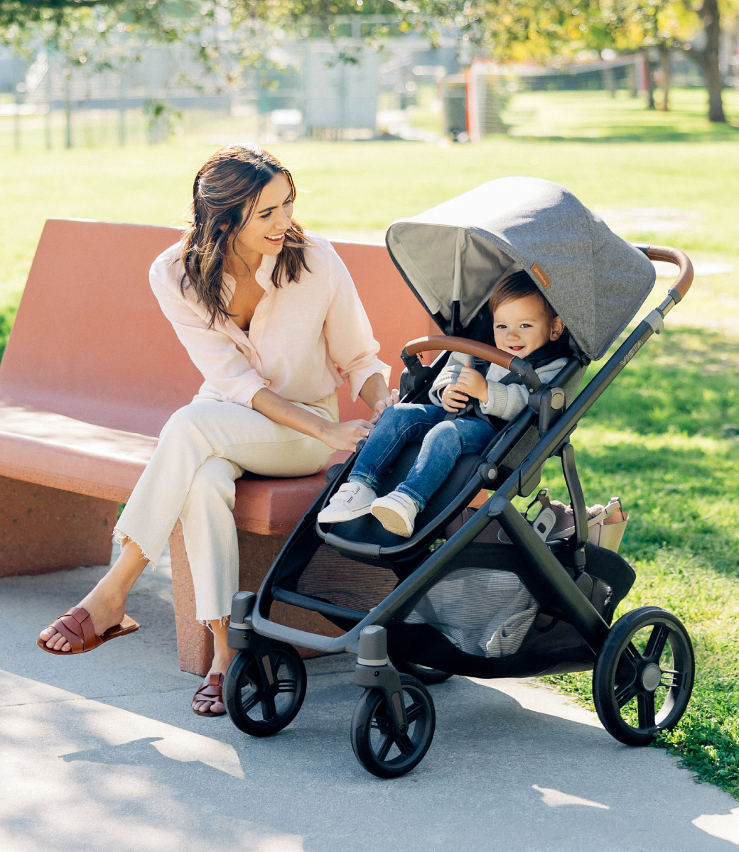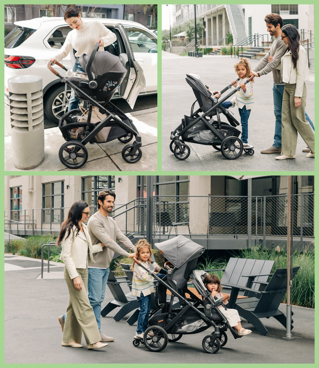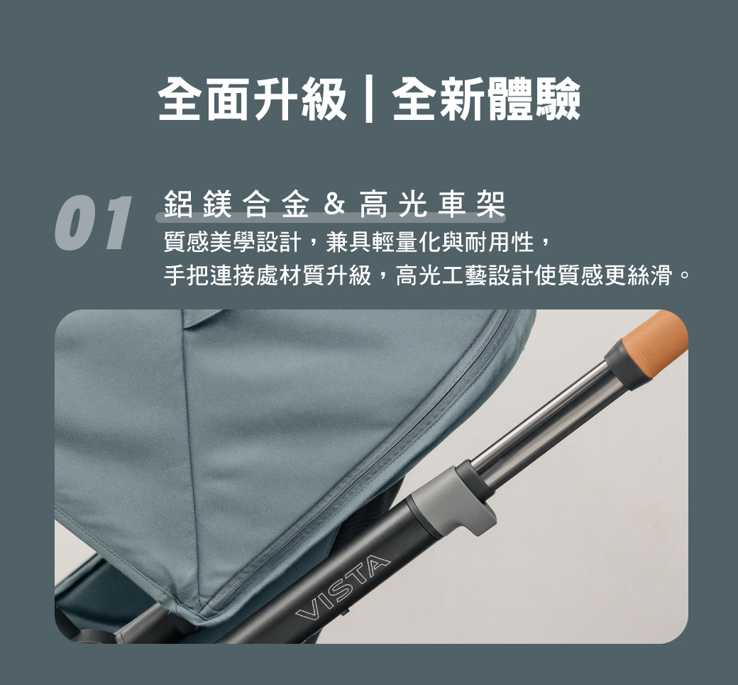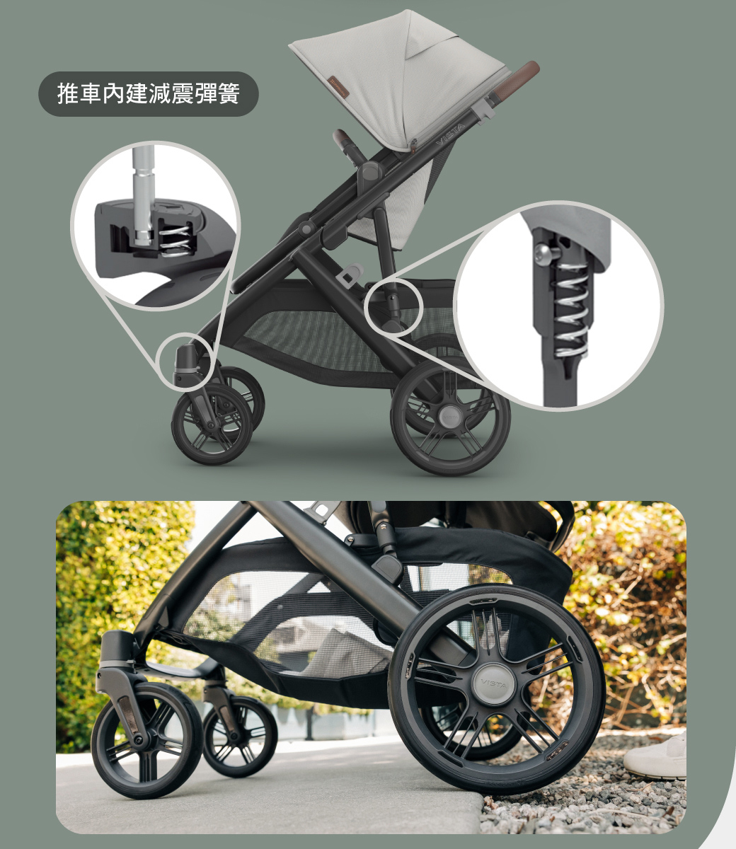 全面升級 | 全新體驗●全天候舒適座椅後背採用透氣式網布設計,同時配有可拆卸椅墊,能對應不同溫度及氣候更換。●避震強化再提升大尺寸輪胎,搭配FlexRide懸吊式避震,回彈不觸底。輕鬆乘載1-3個寶寶,面對各種地形不顛簸。並採用單腳煞車系統。●全新設計反光條車輪外框上新增反光條,讓夜晚外出更加安心安全。●五點式安全帶升級磁吸式安全扣,一鍵調節安全帶,輕鬆方便操作。●質感美學設計-鋁鎂合金材質,兼具輕量化與耐用性。手把連接處,高光設計使材質更絲滑。-手把和防撞桿以REACH認證的真皮皮革包覆。-隱藏式鉚釘設計,營造出更為精緻的美學效果。●最高規格認證GREENGUARD金牌認證,給予清新與健康的環境。●One for all 百變模式及功能-頂級車款,最多可擴充至2個座椅及一組輔助踏板。並可搭配睡箱及提籃。-座椅高度較高,出外可直接當兒童餐椅使用。兩組座椅皆可調整前後兩個方向,也能躺平至180度。-超大容量的置物空間,內容物輕鬆方便取放。-可伸展的遮陽罩,具有防潑水功能,及防曬系數超過UPF 50+,可遮擋有害的紫外線。易開啟且透氣的通風窗,可隨時觀看寶寶的狀況。