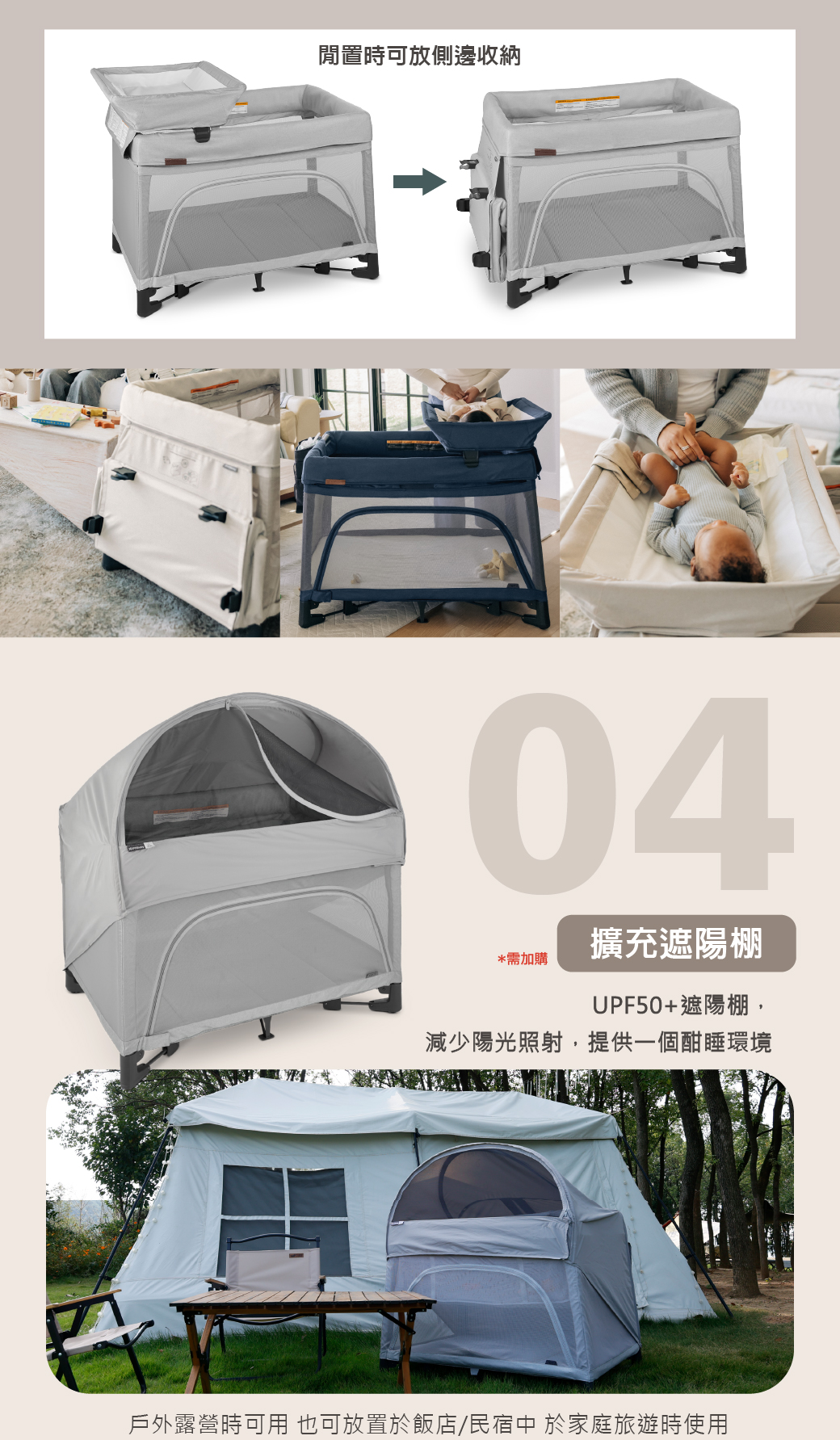 ●多功能嬰兒床,可作為睡床、遊戲床、旅行外出床●時尚簡約外觀可完美融入任何室內空間,不顯突兀●附贈旅行袋,輕便攜帶不占空間。免安裝,單手就能快速開合,方便移動到各種位置●可額外加裝Remi尿布台。不使用時,無須拆卸,旋轉折疊即可收納●下層底部七個支撐點分散受力,提升床的穩定性並更加牢固●上層為可拆卸拉鍊式設計睡床,適合新生兒使用,也可以當床邊床。提供四重安全防護,使用上更加安心●四面網布設計,能隨時掌握寶寶狀況。其一面為拉鍊式互動窗,方便爬行或走路的寶寶進出,父母更輕鬆●三層網狀床墊,不悶熱透氣性佳。床罩可拆下機洗。附贈有機棉製的床包。皆通過ASTM D737測試,安全又安心●有機棉床墊3.8cm厚度,給新生兒寶貝脊椎舒適且高支撐力的保護。不需要額外使用床墊及床罩●通過GREENGUARD綠色環保金牌、JPMA、Good Housekeeping三重認證。給予寶寶健康的空氣品質