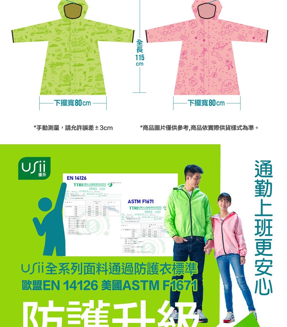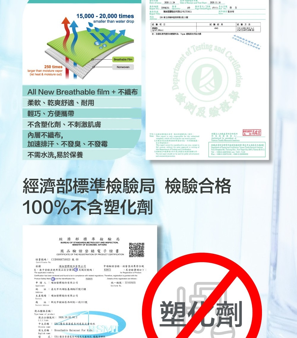 ◆不含塑化劑:USii透氣雨衣通過經濟部標準檢驗局檢驗100%不含塑化劑,不刺激皮膚。