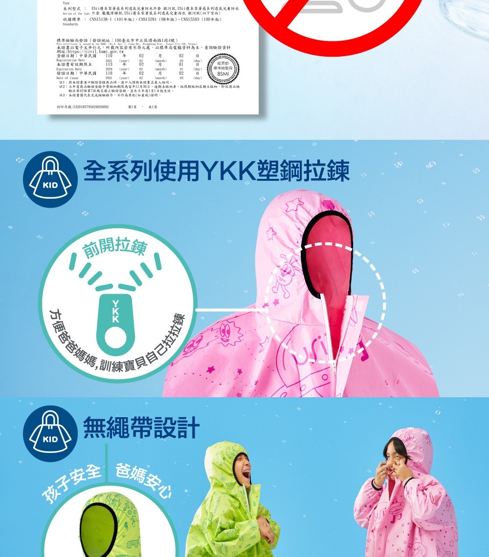 ◆預留書包空間:多變的陰雨天也能輕鬆套上,帽緣、袖口防水包邊條設計,風雨不滲入,孩子肌膚好乾爽舒適。