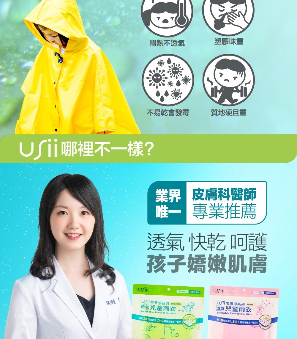 ◆乾爽不黏身:擁有過不只一件雨衣的你,一定要親自觸摸過USii雨衣的特殊材質,柔軟平滑的透氣質料,不僅摸起來不會刺激肌膚,穿起來更不會與身體產生黏答答的黏膩感,方便您在雨中穿脫,並保持身體乾爽。