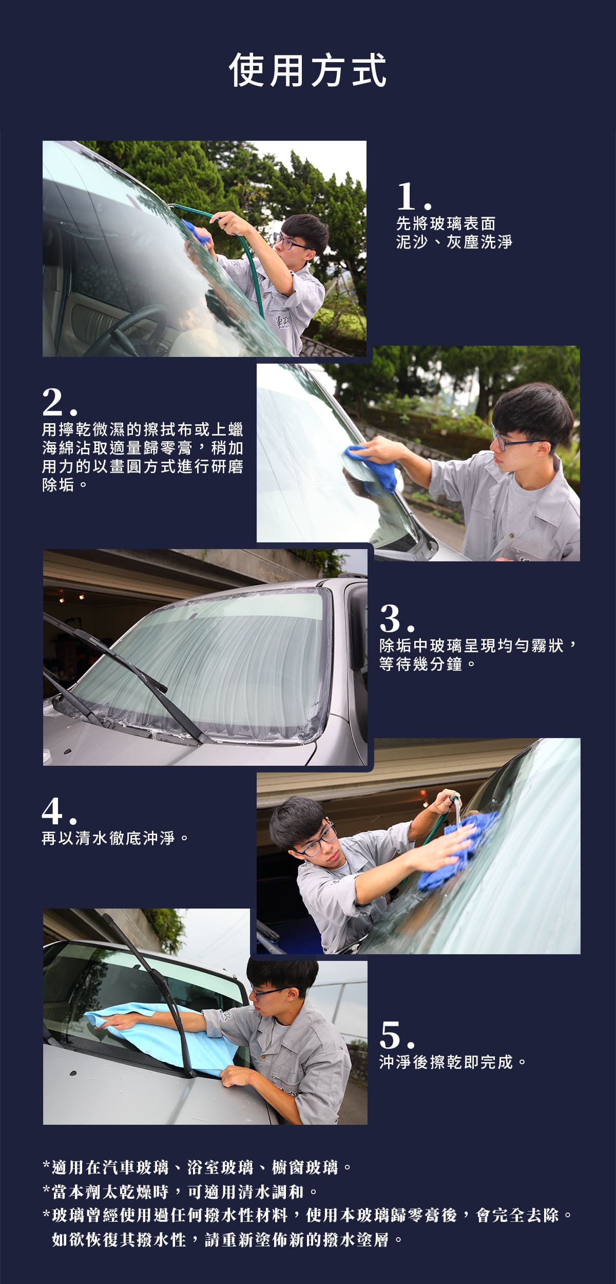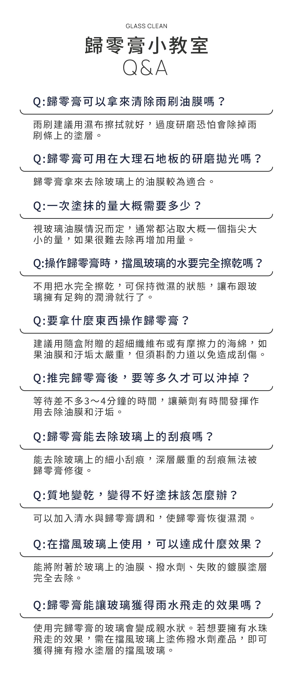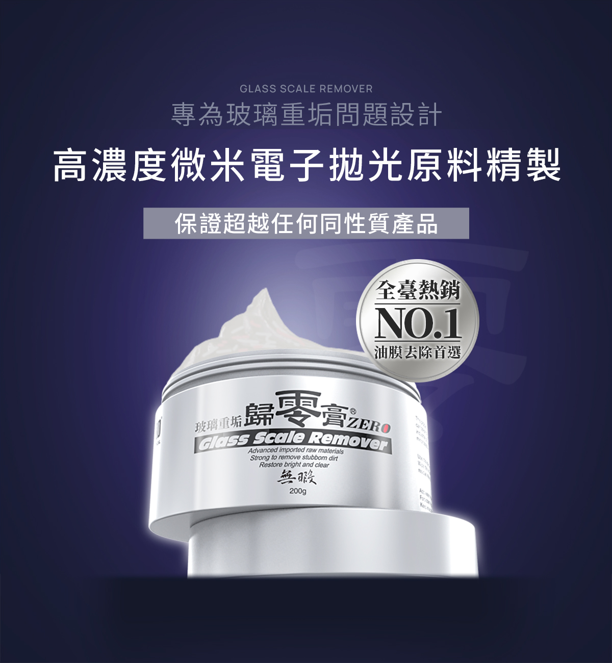 商品介紹‧高濃度微米電子拋光原料精製而成。‧保證超越任何同性質產品,效果卓越。‧專門處理失敗的潑水鍍膜層。‧能夠解決雨刷跳動及異音。‧工業污染、酸雨痕、礦物質凝結物、七彩油膜等。‧玻璃重垢附著物都能輕易去除。‧玻璃上的刮傷痕、亂紋,可用打磨方式消除。使用建議‧玻璃曾經使用過任何撥水性材料,使用本玻璃歸零膏後,會完全去除。‧如欲恢復其撥水性,請重新塗佈新的撥水塗層。‧想擁有水滴快速飛走的效果,建議使用撥水劑保養。使用方式1.先將玻璃表面泥沙灰塵洗淨。2.用擰乾微濕的纖維布擦拭或上蠟棉沾劑,以畫圓方式塗抹玻璃研磨除垢。3.能使用在汽車玻璃、浴室玻璃、櫥窗玻璃。4.如遇膏劑有硬化現象,可加適量清水調和。觀看影片>【玻璃去除油膜】規格說明‧品名:玻璃重垢歸零膏‧成分:微米稀土CeO2拋光料、乳化劑‧容量:200g‧附件:擦拭布x1(款式顏色隨機)‧產地:台灣KYOEI化學實驗室注意事項‧請在通風陰涼處使用。‧皮膚過敏者或長時間使用者請戴保護手套。‧不慎誤食不要催吐,並立即就醫。‧請避免兒童接觸,若不慎接觸到眼睛,請以大量清水沖洗並立即就醫。‧玻璃專用,請欲於非玻璃以外的材質表面。‧請勿於太陽直射或高溫的環境下操作。‧清除本產品效果,請使用玻璃專用研磨劑。‧因每台車況與個人使用劑量不同,呈現效果請依實際操作為主。‧歸零膏為膏狀清潔用品,運送過程搖晃易導至內容易物呈現不規則樣,此屬正常現象,不影響產品品質,可安心使用。收到後靜置一段時間,即可恢復表面平整。