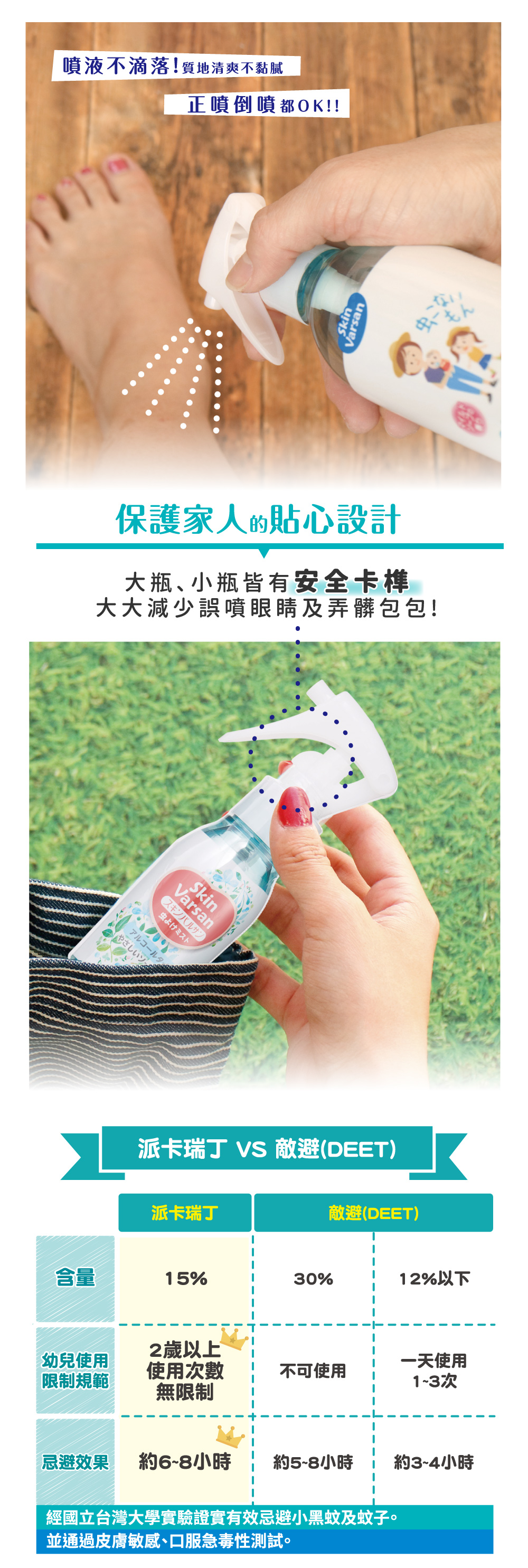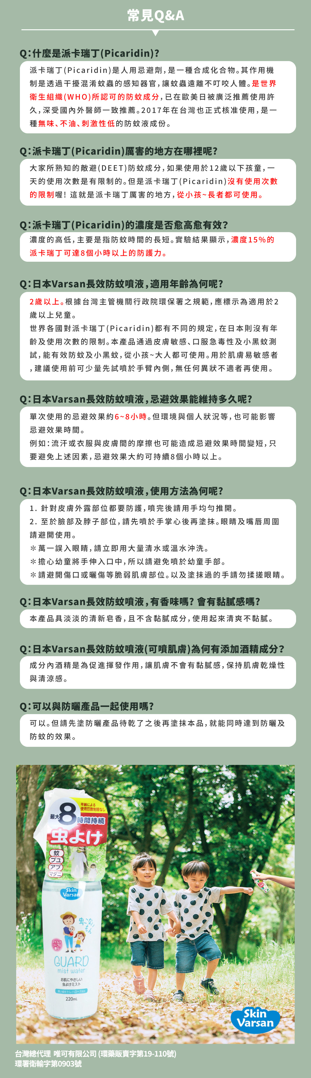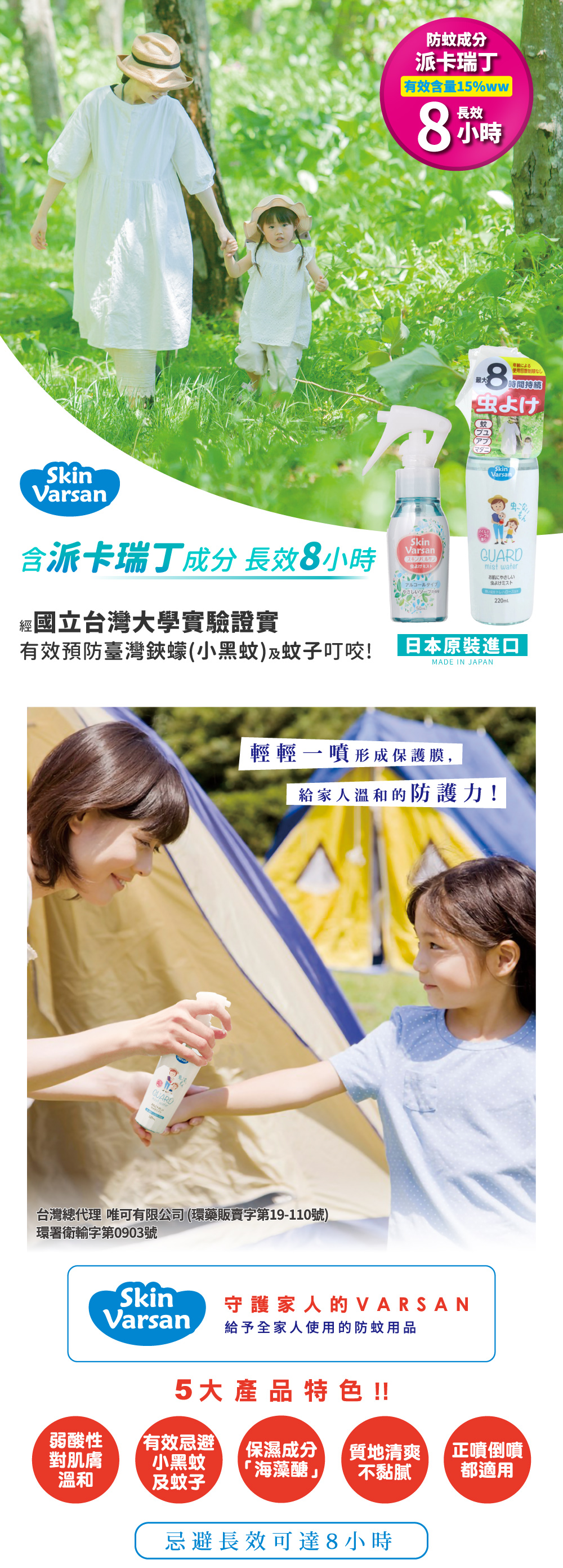 夏季必備,含15%w/w派卡瑞丁成分,忌避蚊子&小黑蚊效果佳,可鎖式噴頭,外出攜帶便利!!不含敵避DEET,忌避長效可達8小時,含保濕成分配方,散發淡淡清新皂香,清爽不黏膩,小孩&大人都適用,輕輕一噴形成保護膜,給予家人溫和的防護力。 有效忌避臺灣鋏蠓(小黑蚊)及蚊子,長效可達8小時。不含敵避DEET,小孩&成人皆可使用。通過皮膚敏感、口服急毒性測試。(並非適用所有膚質)經國立台灣大學實驗證實有效預防小黑蚊及蚊子叮咬。含「海藻醣」保濕成分,無添加Paraben類防腐劑及色素。正噴或倒噴都適用,使用起來方便順手。使用次數無限制,可噴灑於肌膚或衣物,攜帶便利。噴液不滴落,質地清爽不黏膩。台灣總代理 唯可有限公司(環藥販賣字第19-110號)許可證字號:環署衛輸字第0903號品牌: VARSAN有效成分及含量:派卡瑞丁(Picaridin)15%w/w產地:日本有效日期:4年製造日期:220ml-2026.2【使用上注意事項】使用前先看標示1. 請避開眼及口周圍、黏膜或傷口等脆弱肌膚部位。誤觸時,請立即用清水沖洗。2. 避免誤入眼睛、誤飲、誤食或吸入。使用後不要用手揉搓眼睛。3. 萬一誤入眼睛,請立即用大量清水或溫水沖洗。4. 若有任何不適,請立即停止使用。5. 不要隨意亂噴,建議於蚊蟲較多的戶外或必要場所再使用。6. 忌避效果約6~8小時。7. 使用後,會因時間及流汗等影響忌避效果,請適度的加以補噴。8. 本品含0.1%微量薄荷醇,對於蠶豆症及孕婦,使用前請詢問醫師。【警告】1. 使用前先看標示。 2. 不適用於2歲以下孩童。 3. 請勿直接塗抹或噴於臉部或傷口,並避免接觸眼睛以免造成刺激。 4. 若有過敏現象須立即停止使用。 5. 本產品含「3-Methy1-4-(2,6,6-trimethy1-2-cyclohexen-1-yl)-3-buten-2-one(CAS No. 127-51-5)」、「Citronellol(CAS No.106-22-9)」及「2-(4-tert-Butylbenzy1)propionaldehyde(CAS No.80-54-6)」香料成分。 【中毒症狀、急救及解毒方法】若有任何不適症狀,請立即停止使用,並持本標示就醫。並告知本品含乙醇及派卡瑞丁成分。 【使用及儲藏時應注意事項】使用時應注意事項:請勿使用於塑膠製品、塗料面、傢俱、皮革類、飲食物、餐具、玩具、飼料、重金屬及寵物等。 儲藏時應注意事項: 1. 使用後,請蓋緊瓶蓋。 2. 請勿放置高溫及陽光直射處;保管於幼童不易取得之陰涼處。