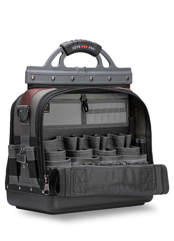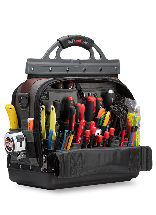 工具整理袋經過多項改進,更適合服務技術人員的工具收納和日常工作。 TECH-XL 工具包擁有 80 個口袋,空間充裕,可輕鬆收納手動工具、零件盒、儀表、無線衝擊鑽和其他大件物品。此外,還增加了 9 個小型氯丁橡膠口袋,用於存放鑽頭和鑽頭延長器。
