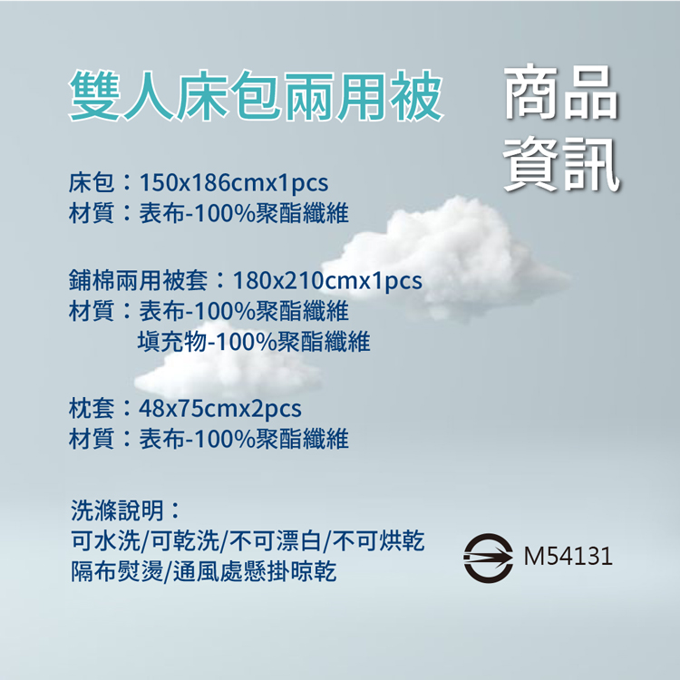 ★內容件數與尺寸: 雙人床包x1件-5x6.2尺(150x186cm) 鋪棉兩用被*1件-6x7尺_(180x210cm) 枕套x2個(48x75cm)