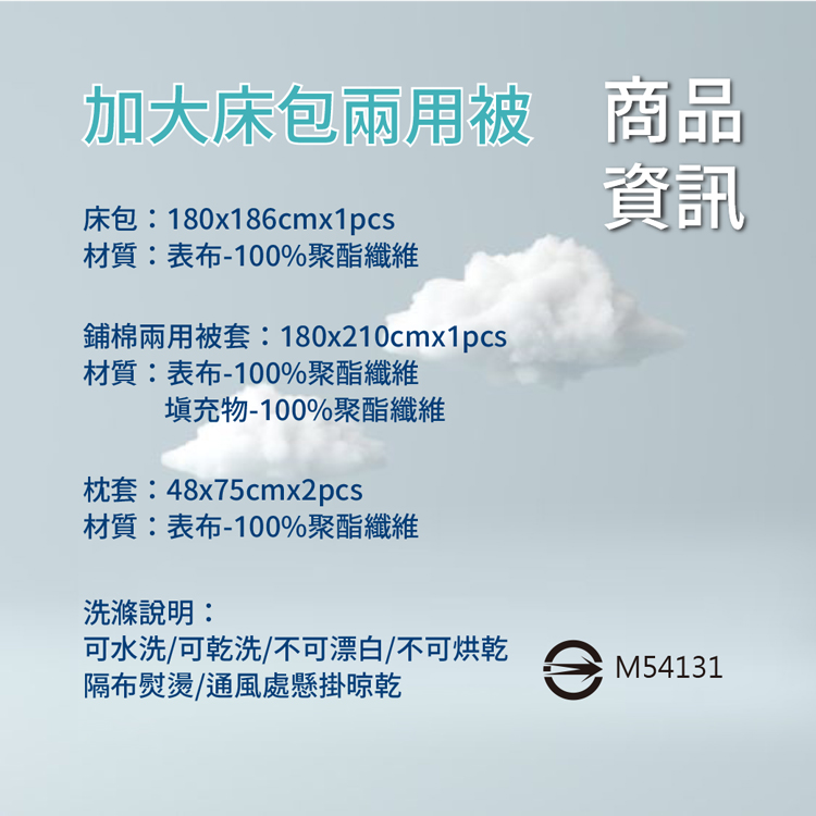 ★內容件數與尺寸: 加大床包x1件-6x6.2尺(180x186cm) 鋪棉兩用被*1件-6x7尺_(180x210cm) 枕套x2個(48x75cm)