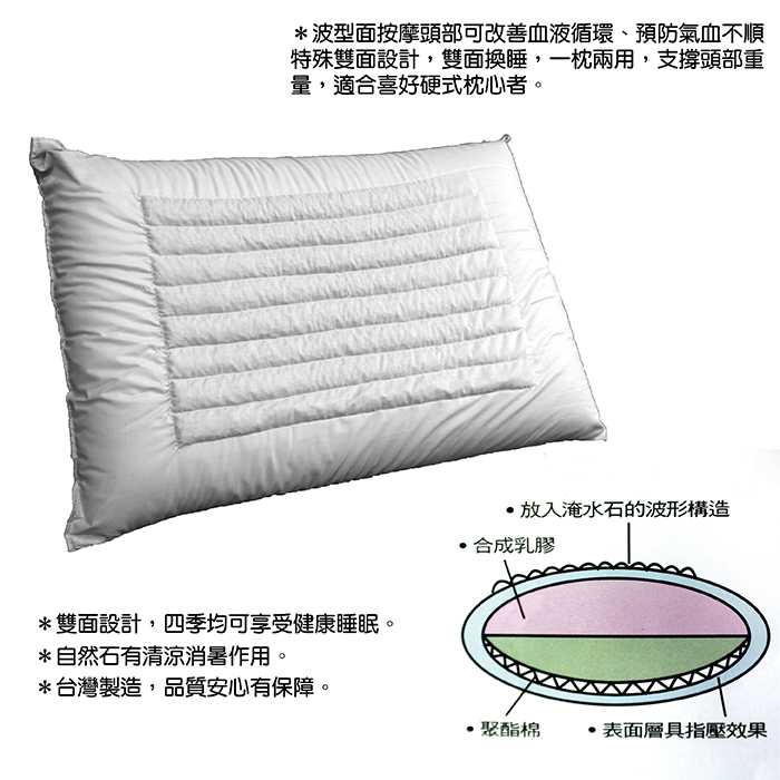 ‧特色:(1)天然溪石的枕面具有清涼消暑的作用。(2)波形構造具有按摩功能,容易入眠精神佳。(3)淹水石的磁場具有安神、醒腦等功能。(4)特殊雙面設計,一年四季皆適用。