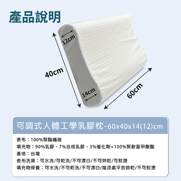﹝內容件數與尺寸﹞可調式人體工學乳膠枕*1件-60x40x14/(12)cm ±5%