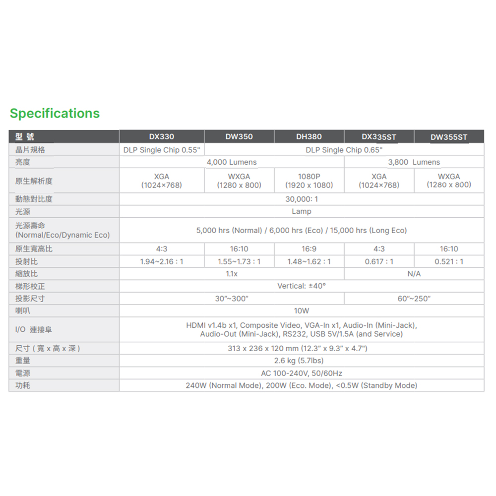 DX335ST具有高亮度和30,000:1高對比度,即使在任何明亮環境下也能提供250吋大尺寸投影畫面,尺寸輕薄可攜帶、重量輕且安裝快速,使該系列成為教室和會議室的理想選擇,此系列採用頂蓋和節能設計,易於更換燈泡,燈泡壽命長達最高15,000小時,此外,DX335ST、DW355ST、DH385ST採用短焦設計,在短距離內投影100吋的大型影像,可節省空間、易於架設。