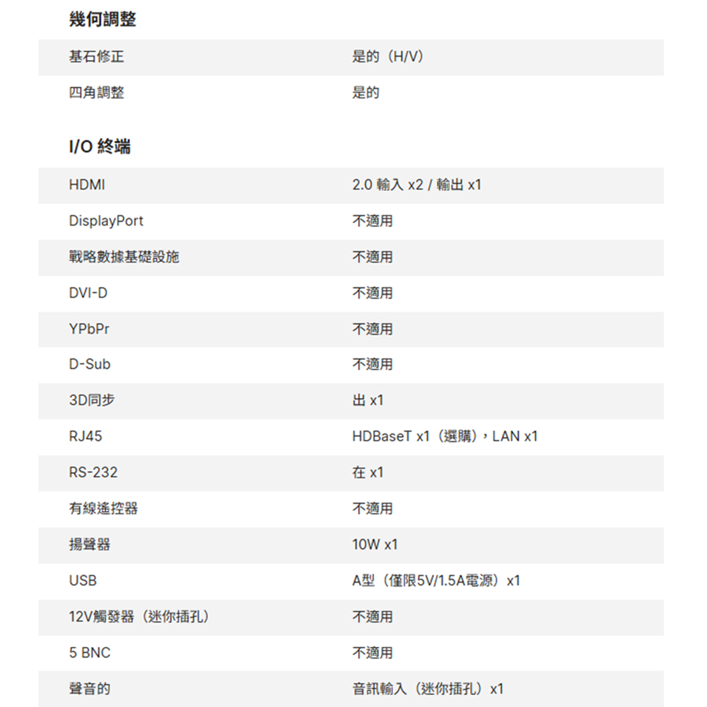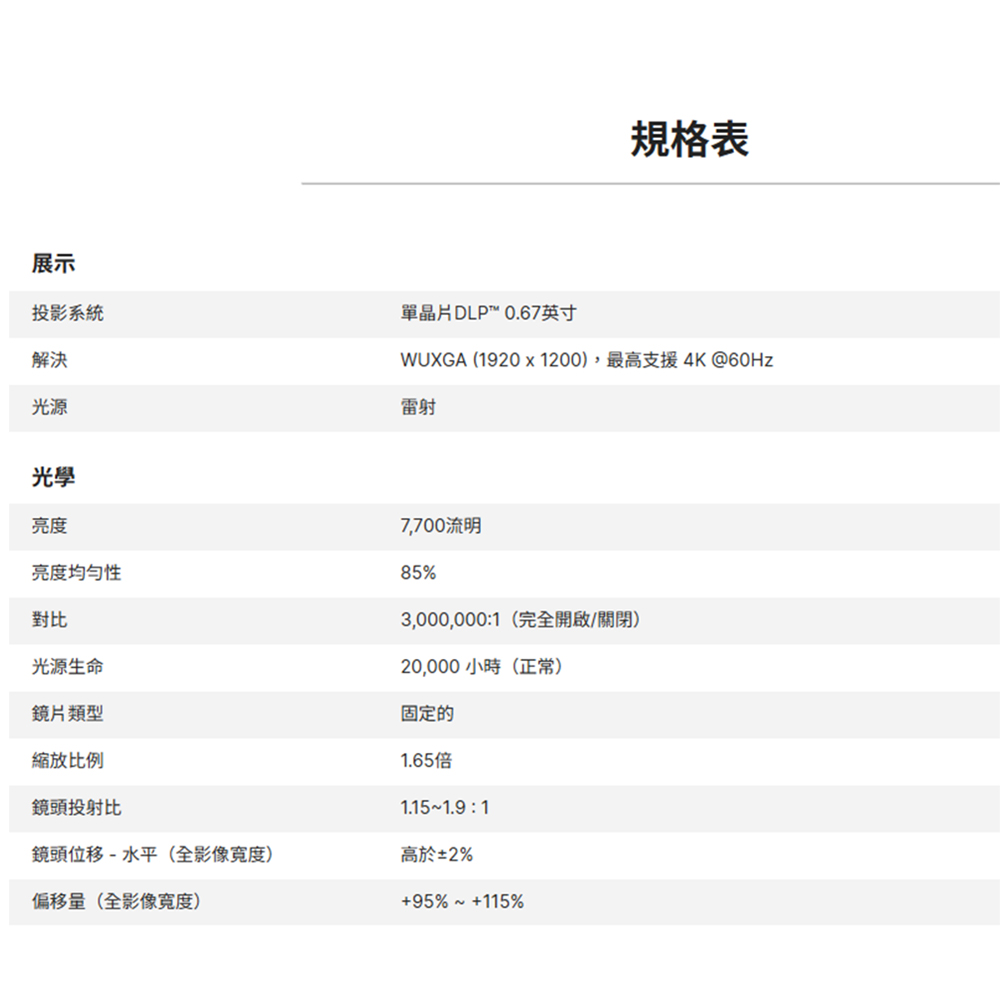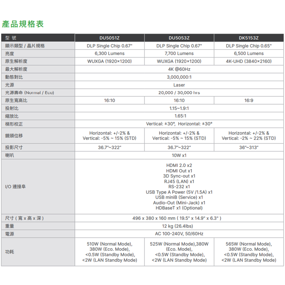 DU5053Z具有7,700流明的高亮度、高解析度,以及3,000,000:1高對比度,使畫面更清晰立體,並採用新一代色彩技術,提供完美的圖像顯示。