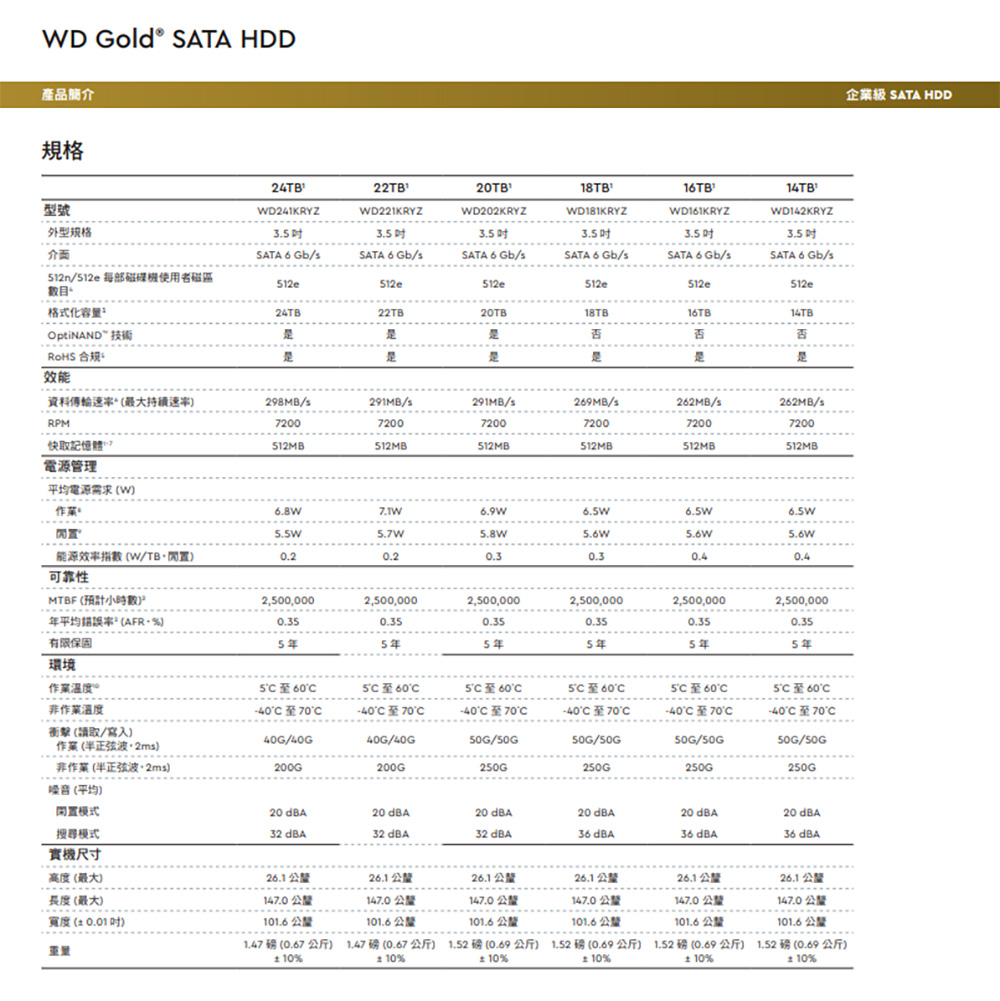 昌運監視器 WD金標 20TB(WD202KRYZ) 3.5吋企業級硬碟