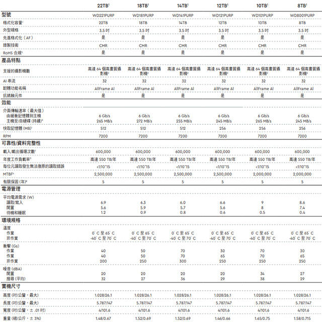 昌運監視器 WD221PURP WD紫標 PRO 22TB 3.5吋監控專用(系統)硬碟